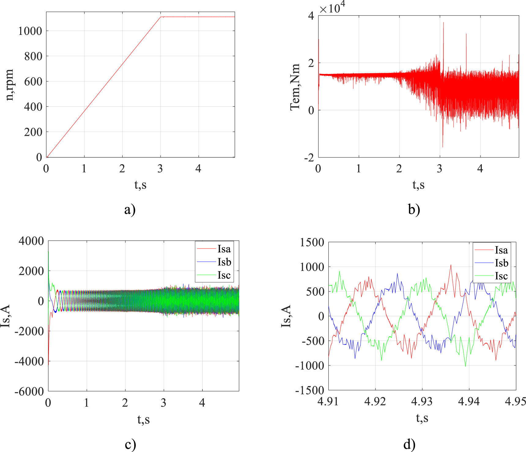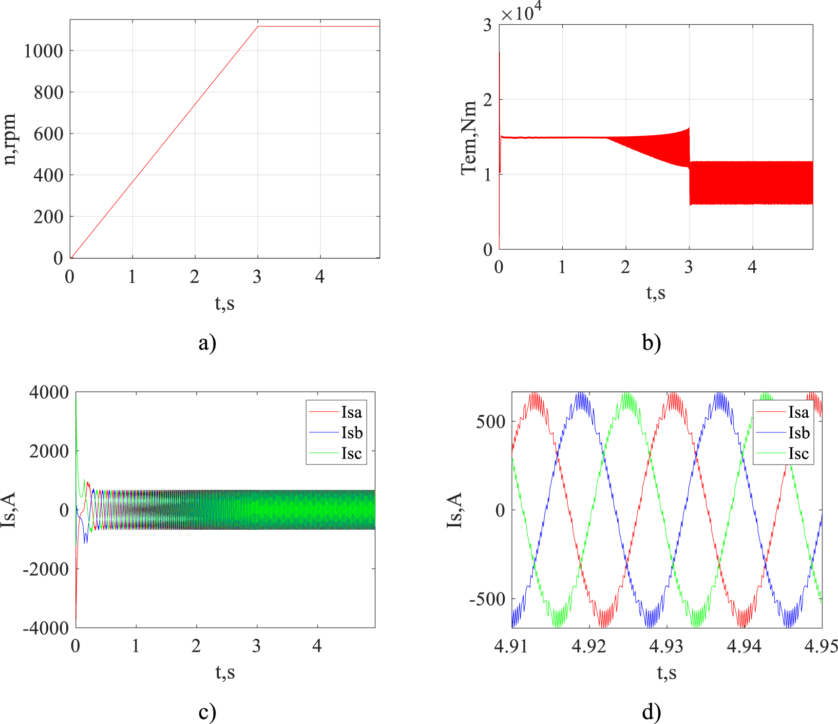Figure 7. Time diagrams of motor shaft rotation speed (a), torque (b), stator currents (c) and stator currents in steady state (d) for the nominal mode with the classical DTC.