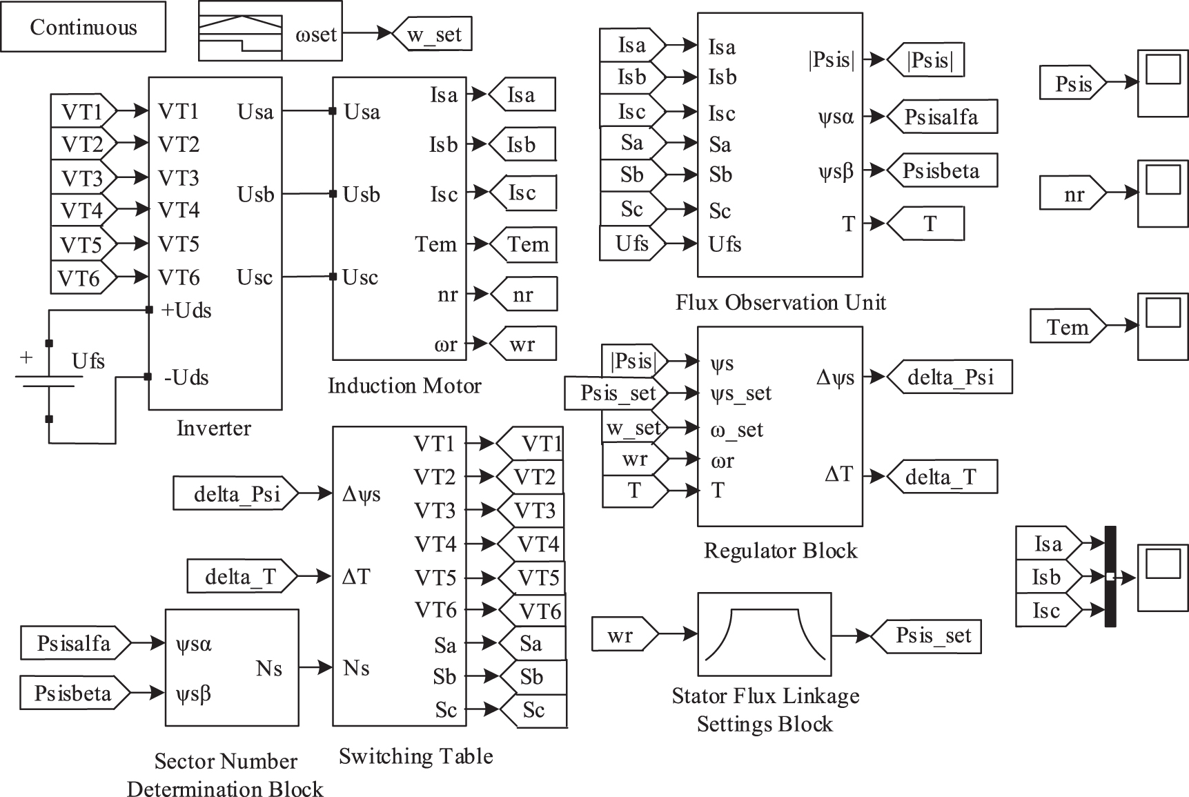 Standard image High-resolution imageFigure 6 shows the following blocks. In the 'Induction Motor' block unified simulation model given in [46]. The 'Inverter' block implements the schematic diagram of the inverter shown in figure 2. Since the electrical part of the induction motor is made on the elements of the Simscape library of the MATLab software environment, the 'Inverter' block is made on the elements of the same library. The 'Switching table' block implements the functions of the switching table block (figure 4). In the block 'Sector Number Determination Block' the algorithm for determining the sector number (10) is implemented. In the 'Flux Observation Unit' block implemented formulas (3)-(9) and (17).