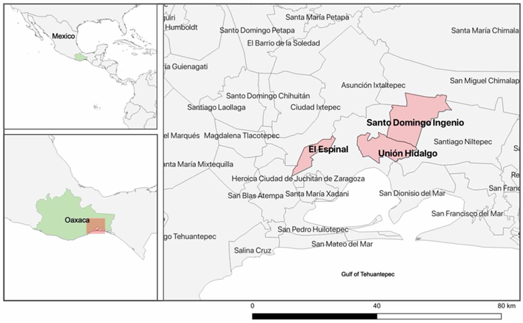 Juchitán is the district of the region where the best wind energy resources are concentrated and where the 'wind energy corridor' has been established. Wind farms are located in five municipalities: Asunción Ixtaltepec, Juchitán, El Espinal, Santo Domingo Ingenio, and Unión Hidalgo. This study analyses the factors affecting wellbeing in the latter three of these localities, which, as will be described in section 4, were selected based on their citizens' general position on wind farms, and their similar characteristics that allow comparability.