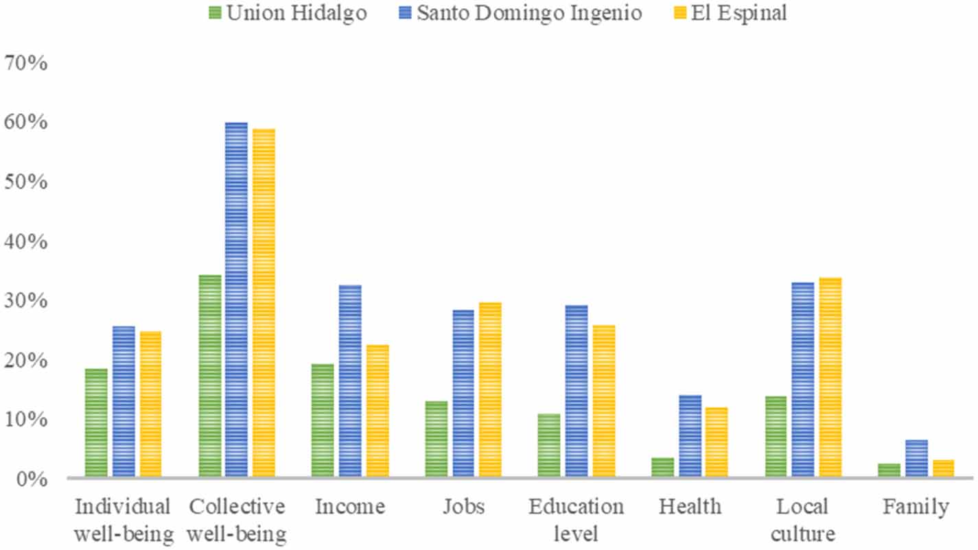 The capability to attain an education was ranked third in the interviews and workshops and intriguingly was valued for different reasons by the different communities. In El Espinal a higher education was considered to be an instrumental capability for getting a job. In Santo Domingo Ingenio, education was a sign of status or success, and an instrument to 'avoid being fooled by the government' (Santiago 2017), whereas in Unión Hidalgo, it was mentioned as a capability for expanding children's access to schooling. Generating income (money), the fourth most valued capability in all three methodologies, was also considered important for different reasons. In El Espinal money was a way to afford 'luxuries' such as eating at a restaurant, travelling, or going to see a movie. In Santo Domingo Ingenio, money meant both to provide basic goods and food for the family, but also 'to live the good life' which was commonly linked to 'alcohol and women'. Finally, people in Unión Hidalgo did not necessarily see money as a source of happiness and instead were more concerned with its importance to live a dignified life including good food (being able to consume meat and fresh produce from the market) and basic education. In sum, quantitative findings offered statistically significant results, while qualitative and participatory methods offered participants more freedom to discuss capabilities not mentioned in the survey; such as the importance of public services and the value of community collaboration, being respected, being treated as equals and being in peace, as well as an explanation of why people value a capability and not another.