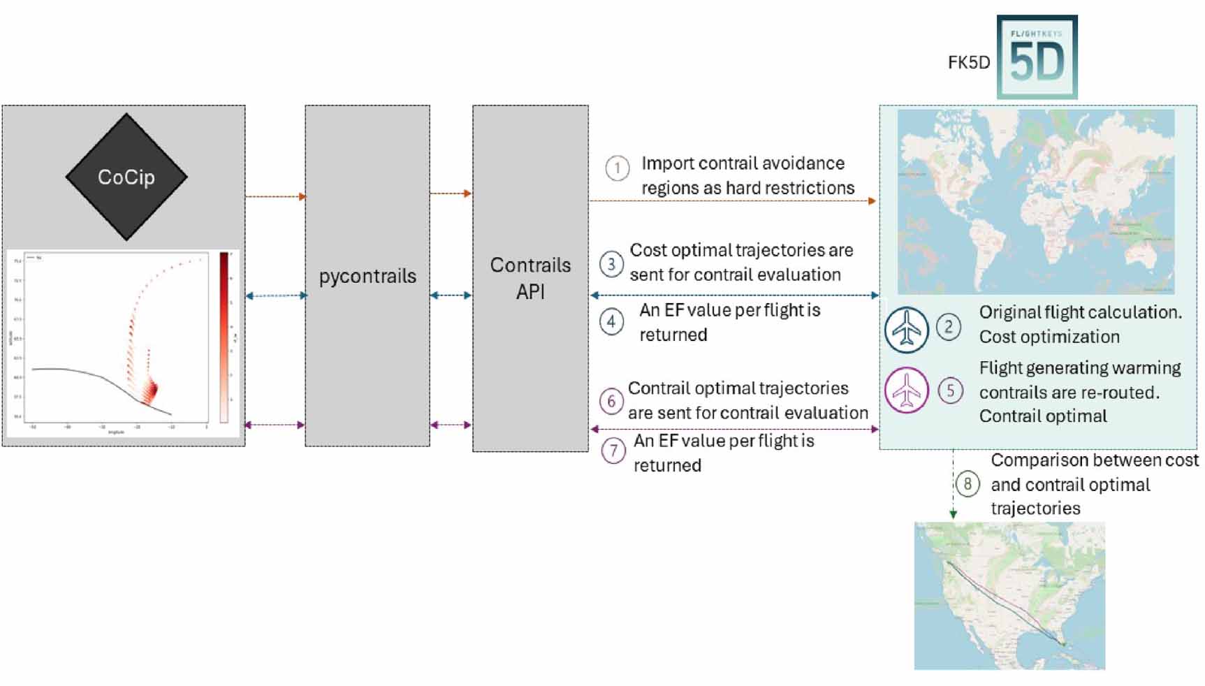 Figure 2. Schematic workflow of contrail avoidance regions import and contrail evaluation and recalculation using the pycontrails library and the FK5D flight planning tool.