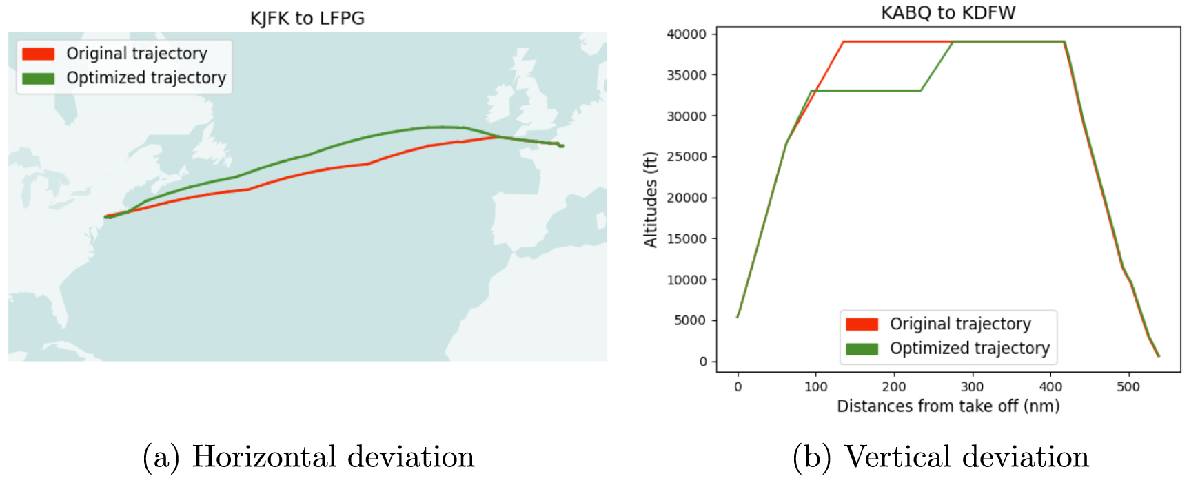 Standard image High-resolution imageThe FK5D trajectory optimizer uses a combination of two established path-finding algorithms from the field of computer science: Dijkstra's algorithm and the A* algorithm [38]. FK5D's optimization problem aims to find the flight plan with the minimum cost. The optimizer considers fuel requirements, weather conditions, and aircraft performance as part of the heuristic cost function. FK5D calculates the cost-optimal flight plan in real-time within a cloud-based environment. Specific implementation details of the FK5D optimizer algorithm are proprietary and cannot be disclosed due to its intellectual property status.