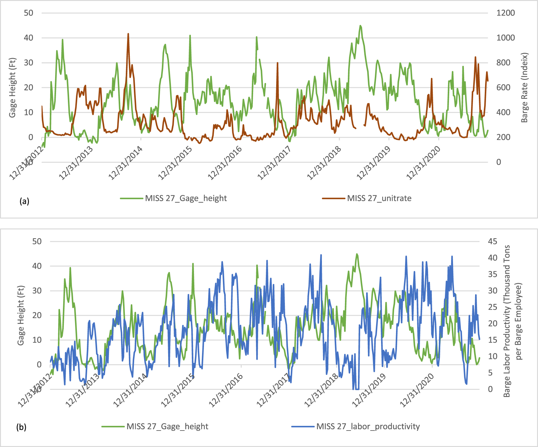 Standard image High-resolution imageFigure 2(b) illustrates the relationship between gage height fluctuations and barge labor productivity over the period from January 2013 to December 2020. The green line represents the gage height at MISS 27, while the blue line depicts the barge labor productivity measured in thousand tons per barge employee. Unlike figure 2(a), which focus on barge rates, this figure highlights a discernible pattern where changes in gage height appear to correspond with variations in barge labor productivity. Specifically, periods of increased gage height generally coincide with higher productivity levels, whereas lower gage heights tend to align with reduced productivity. This correlation suggests that riverine conditions, as indicated by gage height, have a notable impact on the efficiency of barge operations. High water levels likely facilitate better navigation and loading conditions, thereby enhancing productivity, while low water levels may impede these operations, reducing overall efficiency.