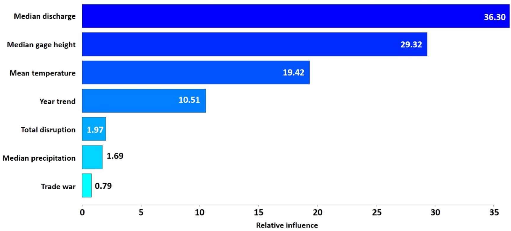 Standard image High-resolution imageFigure 5 presents a similar pattern, examining the relative influences of factors in predicting barge labor productivity, although with a slightly different ranking of the aforementioned variables. For instance, discharge volume, gage height, and temperature emerge as the top three variables with the highest relative influences.