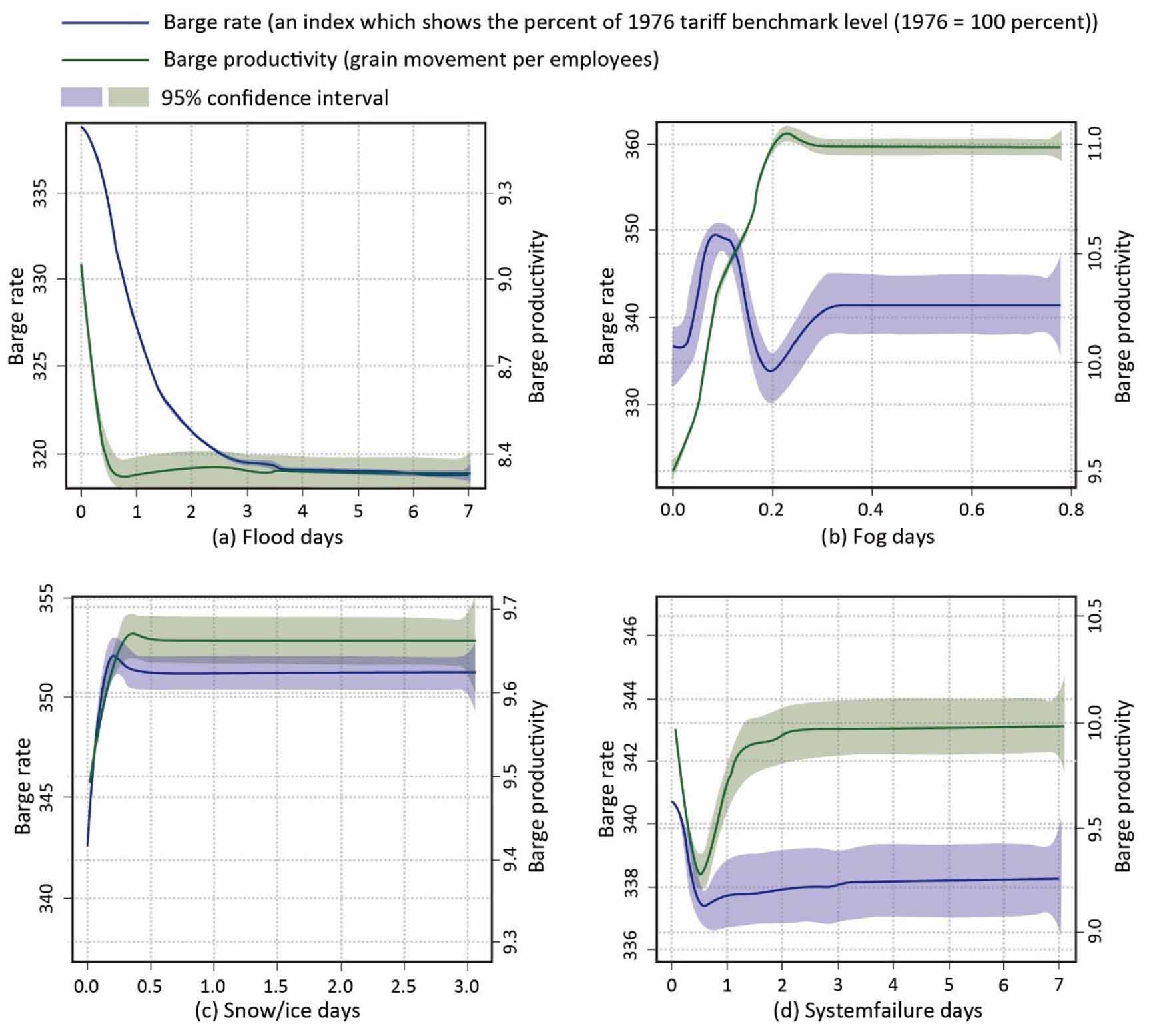 To understand how barge shipping rate may vary due to different types of disruptions caused by different events, we also generated the path dependent plots based on four major types of events: flooding, fog, snow and ice, and system failure. As illustrated in figure 7(a), as the duration of lock and dam closure increases, both the barge shipping rate and productivity are likely to experience a substantial decrease especially in the first two days of closure. As the period of disruption further extends, the magnitude of shipping rates reduction and productivity reduction tend to be decreased as well, until it stabilizes.