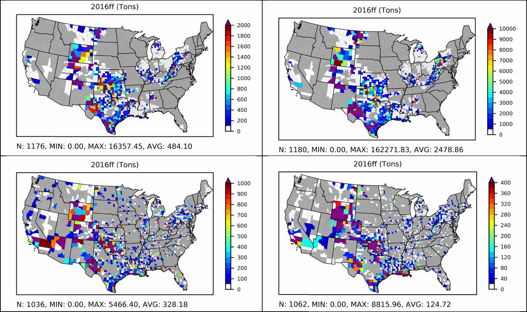Figure 1. Oil and gas emissions of NOx (left), VOCs (right), non-point sources (top) and point sources (bottom) in the EPA NEI 2016 v1 modeling platform. Note: the color scale for each map is different for readibility.