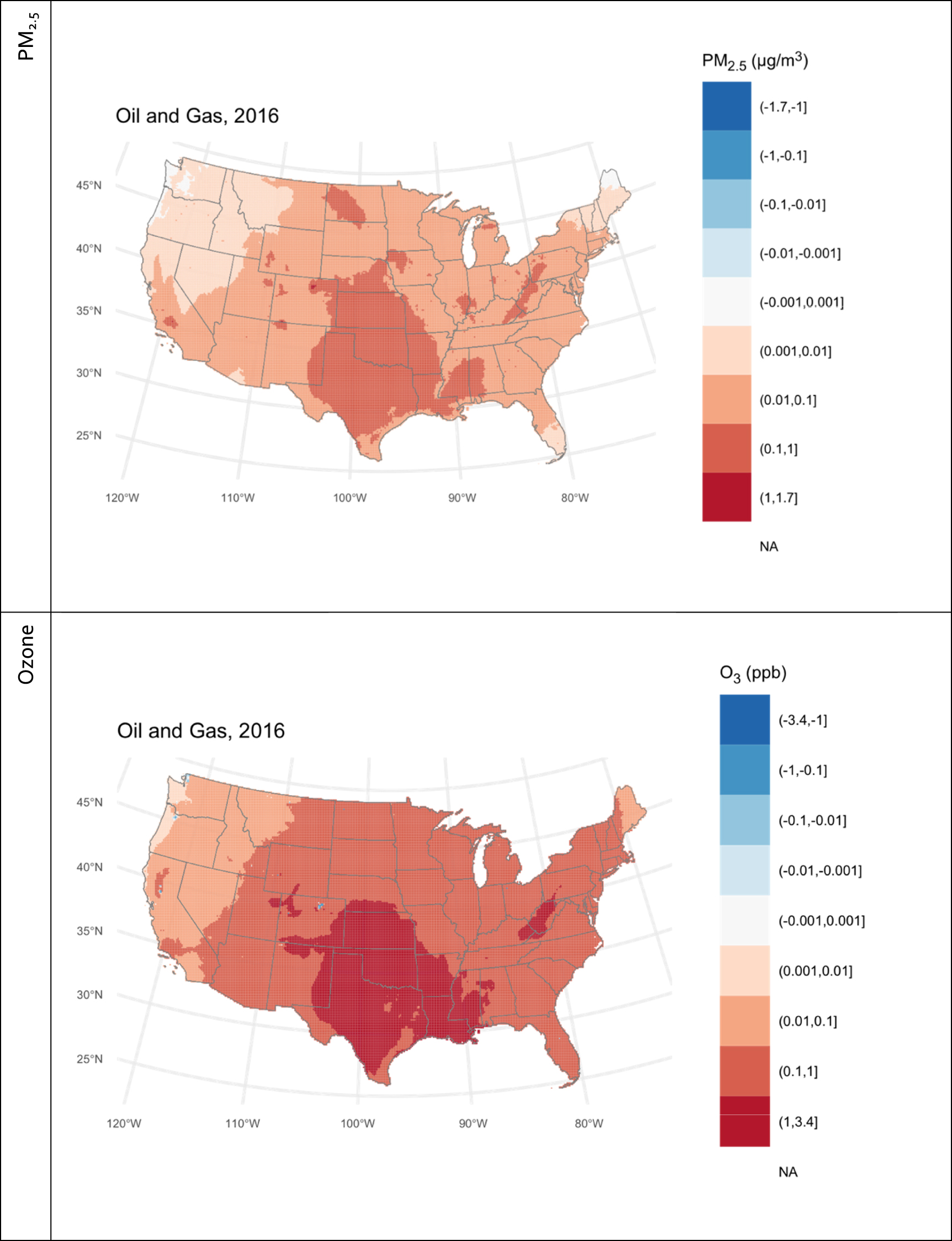 Here, we assess the current air quality and health impacts from the sector in the U.S in 2016, using a novel framework that accepts geospatially resolved emissions data and simulates the consequent air pollution, with advanced representation of gas-phase chemistry as well as comprehensive aerosol treatment with aqueous chemistry, that is relevant to assessing PM2.5, NO2 and ozone impacts. This air pollution model output is then linked to a geospatial air pollution health impact assessment platform to assess and compare the magnitude and distribution of the health impacts of air pollution from oil and gas production activities to better quantify the public health burden and health damages associated with air pollution from oil and gas production so it can be added to climate damage estimates.