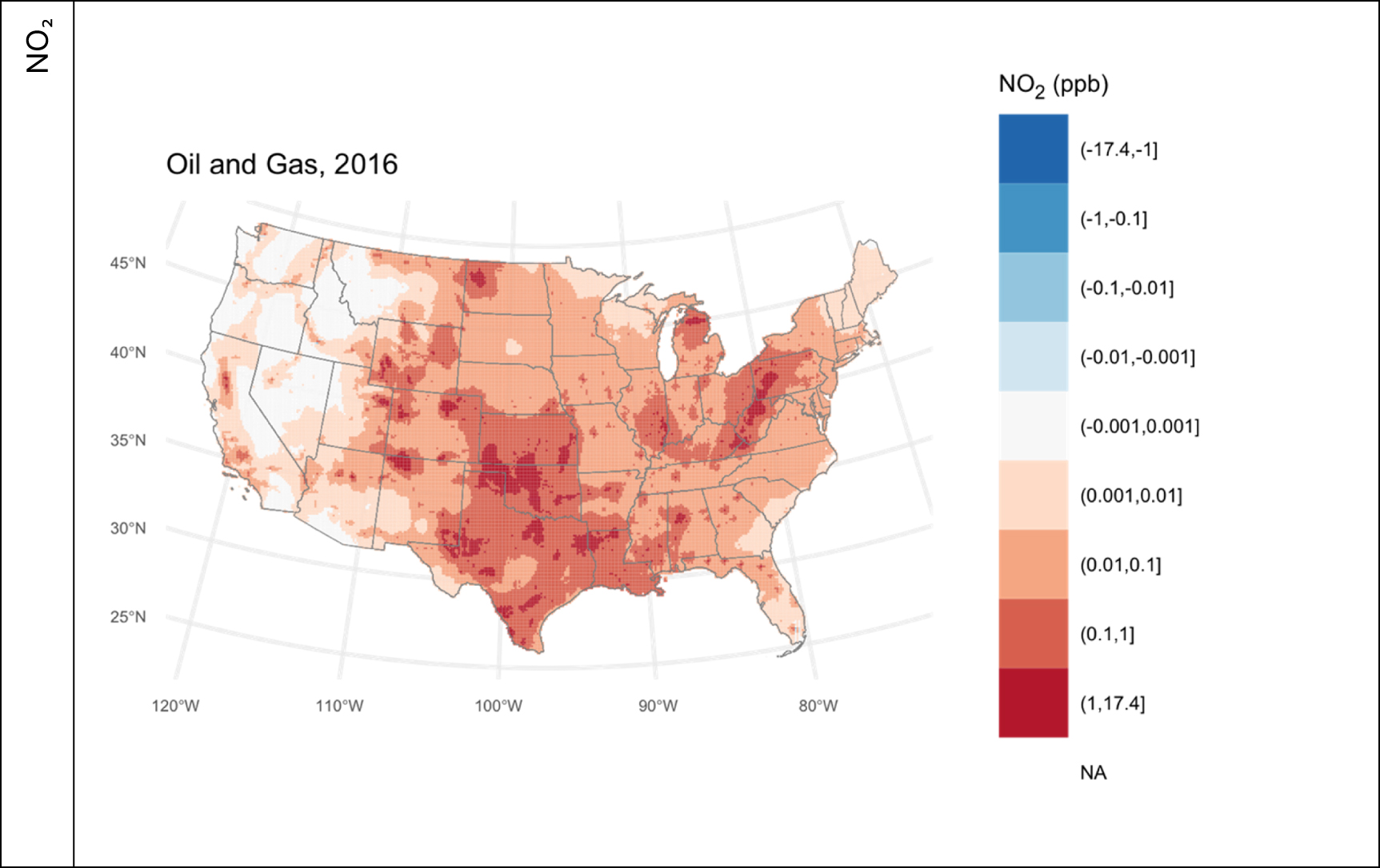 This analysis shows that in 2016, there were substantial health impacts of air pollution from oil and gas production. These impacts are fairly concentrated in regions with O&G production, however there is notable spread to areas outside major O&G producing regions. The impact on NAAQS exceedances is likely an underestimate due to our use of pseudo-annual averages. NO2 is the largest contributor to health impacts, followed closely by ozone and then PM2.5. NO2 impacts are the most tightly constrained, and ozone is the most dispersed, with substantial regional spread, reflecting the atmospheric lifetime of NO2 and PM2.5, and the time for formation of secondary PM2.5 and ozone from precursor emissions [9]. The five states with the highest impacts due to O&G pollution—TX, PA, OH, OK, and LA—all have high levels of O&G activity. However, IL and NY have the 6th and 8th highest impact, despite having little O&G activity in-state.