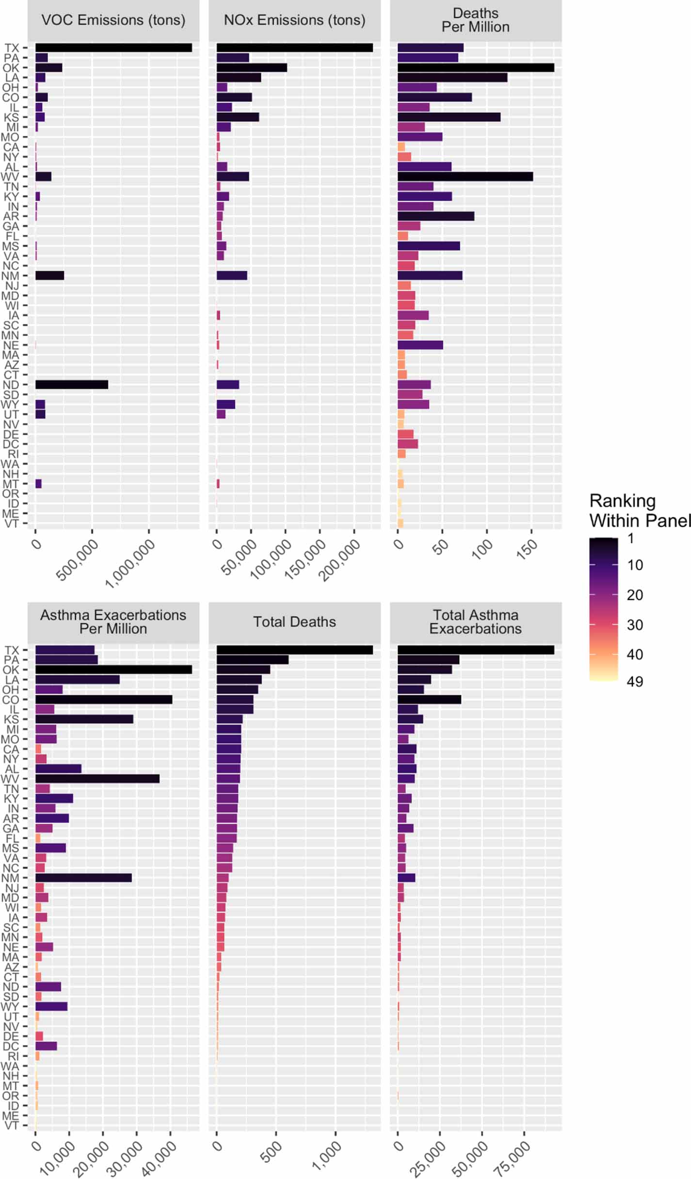 Standard image High-resolution imageFigure 4. State level impacts of oil and gas production in 2016, in terms of state level emissions (in U.S. tons) of NOx and VOCs, state level total deaths and deaths per million due to PM2.5, ozone, and NO2 and total asthma exacerbations and asthma exacerbations per million due to PM2.5 and NO2. States are ordered by ranking of total number of deaths in state, and color indicates the ranking of each state by the variable indicated in each panel.