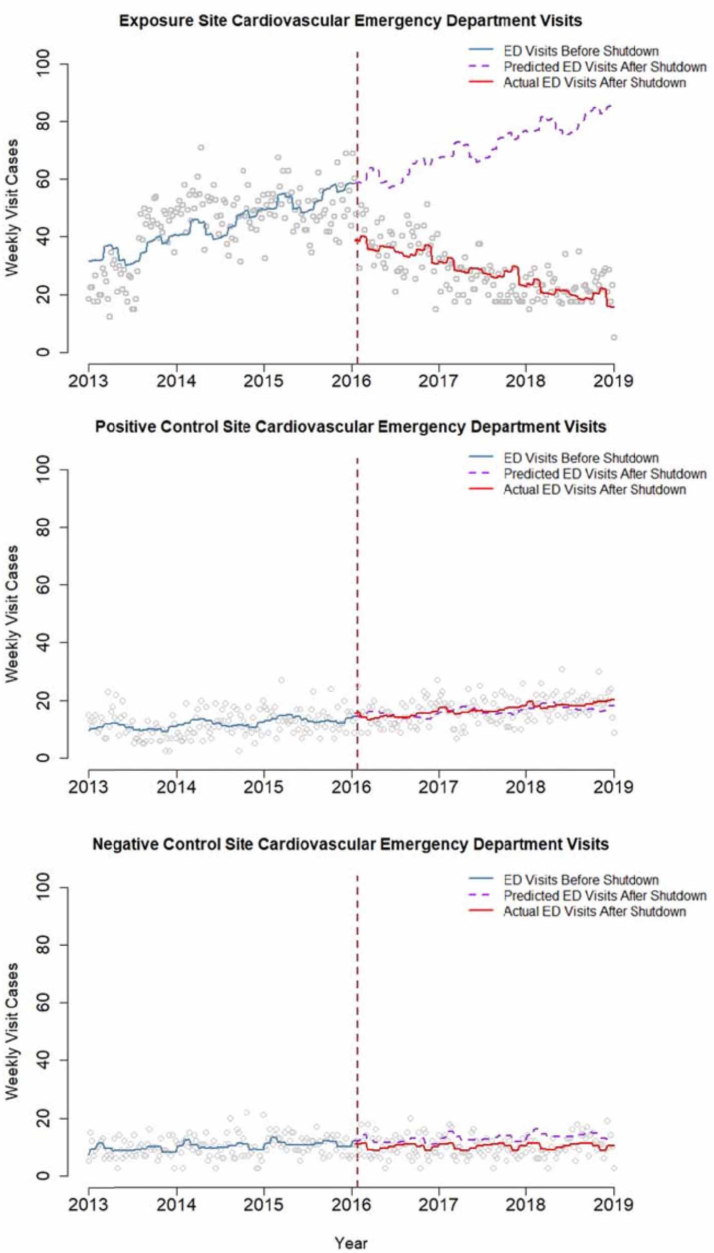 Figure 2. Segmented regression results for weekly cardiovascular ED visits at the exposure site, exposed control site and unexposed control site, 2013–2018.