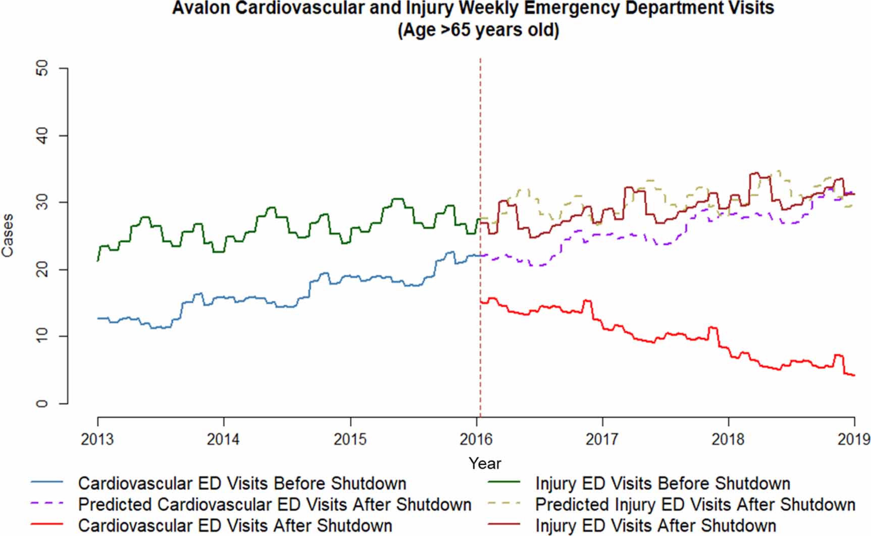 Figure 3. Segmented regression results weekly cardiovascular and injury ED visits of people >65 years of age at exposure site (Avalon).