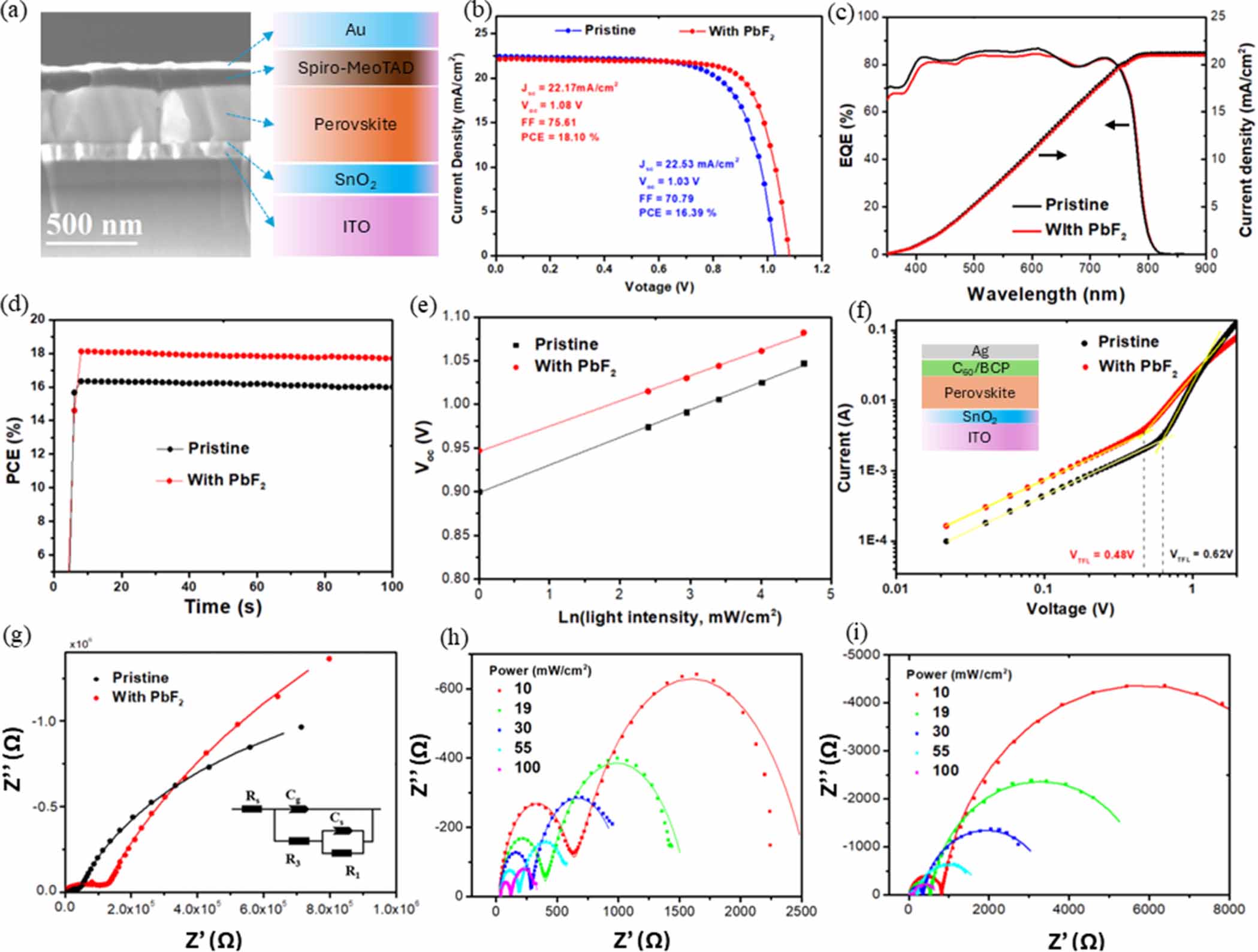Figure 4. (a) Cross sectional SEM image of the PSC device and an illustration of the device configuration; (b) the J–V curve of the champion devices; (c) the EQE spectrum and the corresponding integrated Jsc obtained from EQE measurement of the PSCs; (d) the stable performance of the pristine and the target (with PbF2) device; (e) the plot of Voc of the devices as a function of light intensity; (f) The I–V characteristic plot from space charge limited current (SCLC) measurement of an all-electron device containing perovskite film with and without PbF2. (Inset showing the configuration of the device); (g) impedance spectra of the PSC devices with and without PbF2 additive in dark condition, the continuous lines are the fitting lines. Inset is the equivalent circuit; the impedance spectra under different illumination intensity (h) the pristine device and (i) device with PbF2 additive.