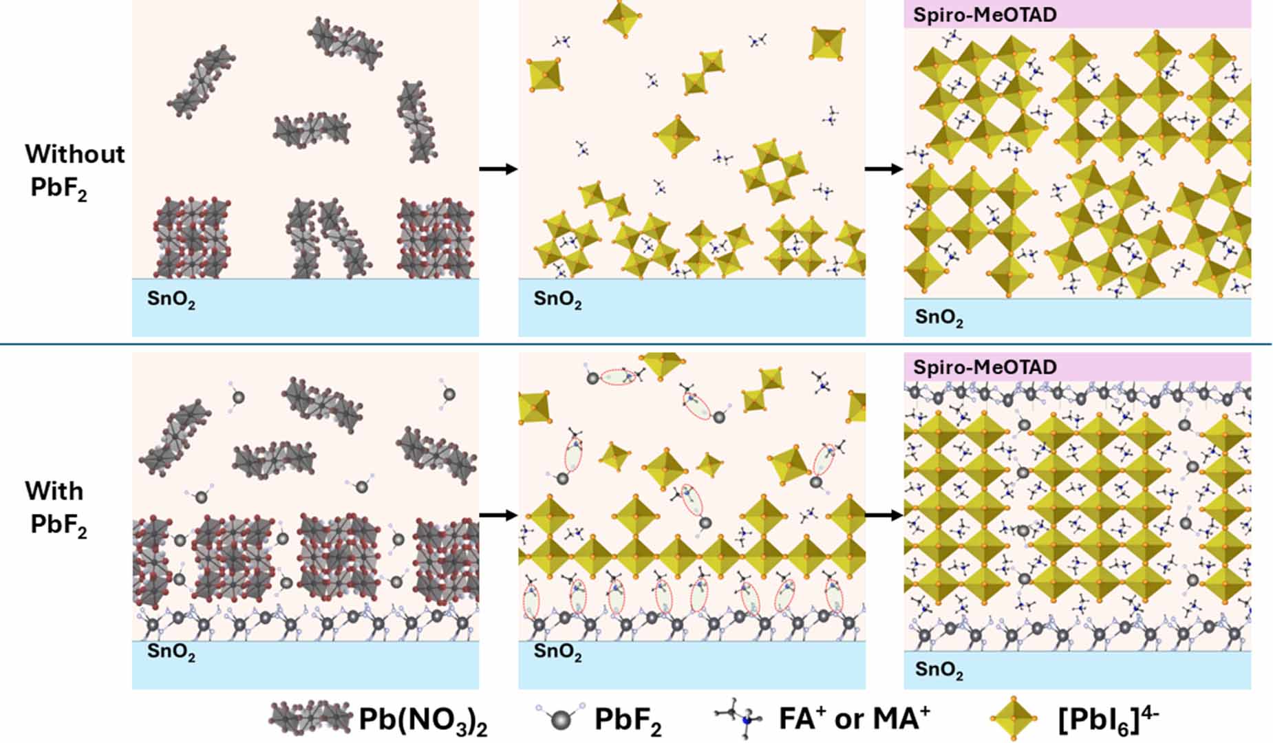 Figure 6. Illustration of the crystallization process of the perovskite film with and without PbF2 additive.