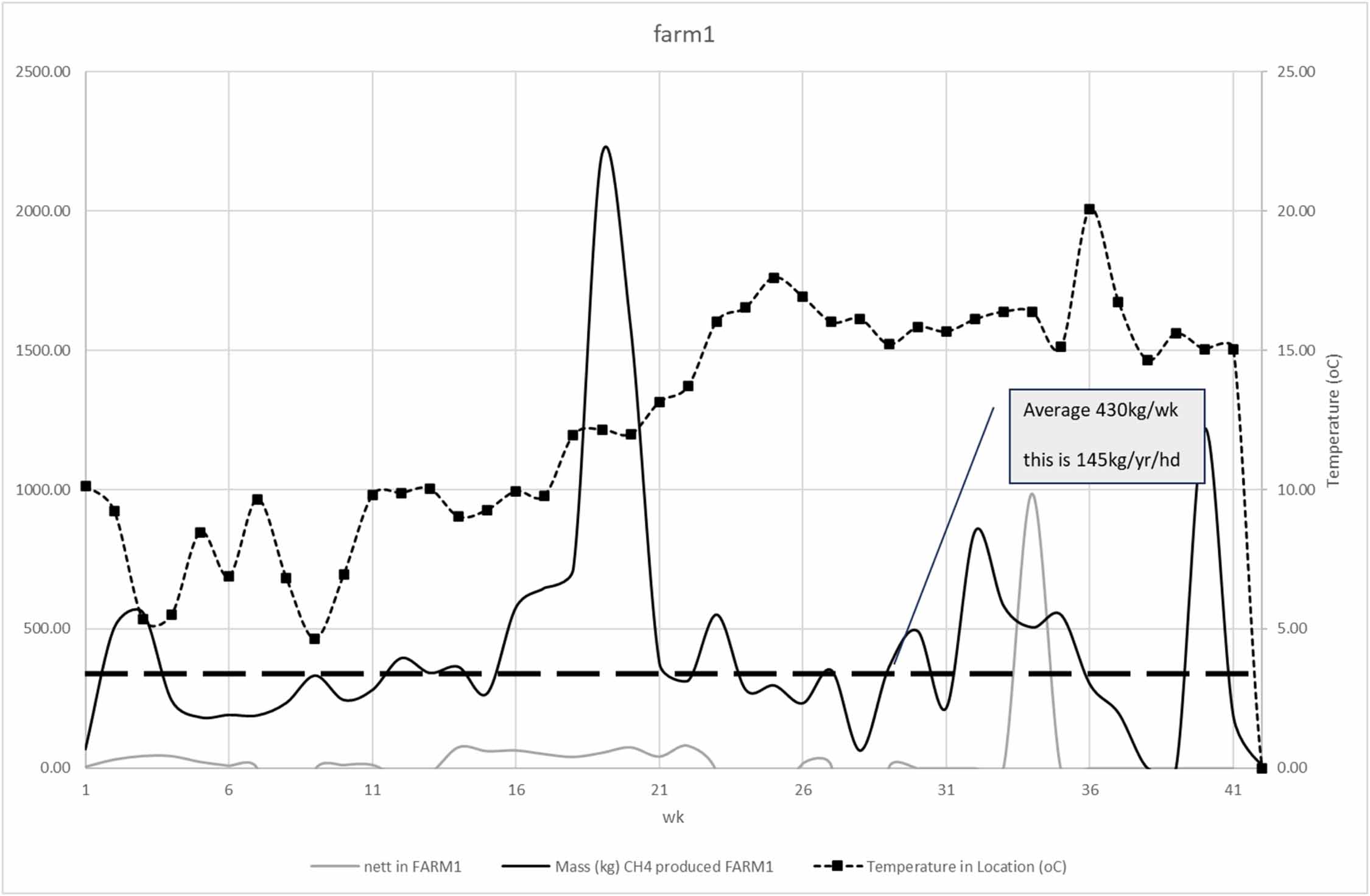 Standard image High-resolution imageFigures 1 and 2 show the methane emissions from these two dairy farms over a year, alongside air temperature. Figure 1 is shown without the solar and rainfall traces to emphasise the lack of correlation with air temperature. The mesophilic range anaerobic digestion process is most active when the target media is between 25 and 30 °C and tends towards increasing inactiveness below 15 °C. That considered, the first half year air temperature is below 15 °C and so we would not expect considerable methane being produced. Further, when the air temperature increases in the summer months there is not significant increase in production. Indeed, the grey line at the bottom of the graph shows the nett flow into and out of the storage facility and hence mixing due to flow shows a delayed production. From the graph this appears around six weeks after the nett flow. (Note this is a new facility, and so there was only flow into it during the period when measurements were taken.