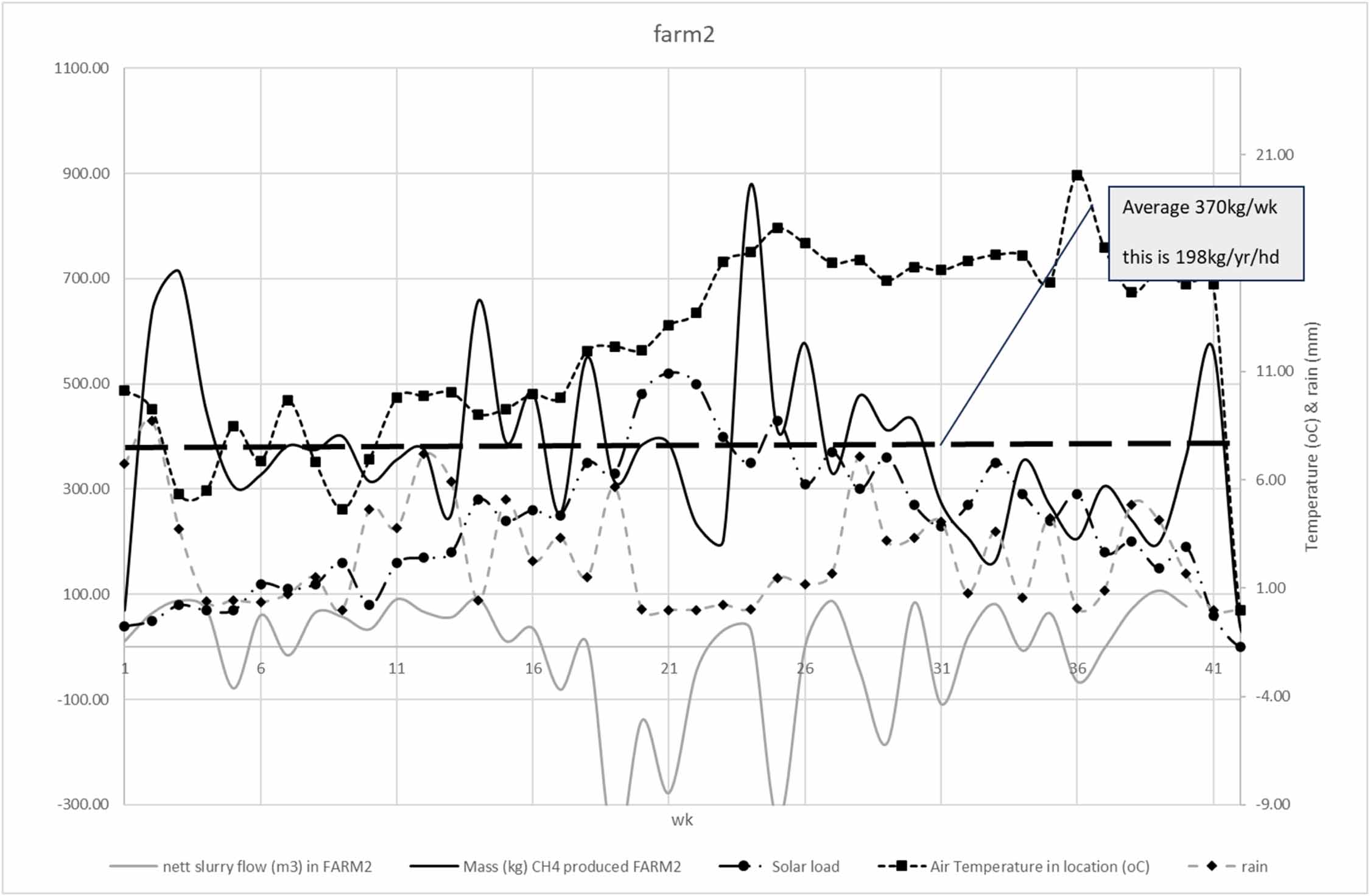 Figure 2 shows measurements from an older facility so there are both positive and negative flows. Large flows create agitation leading to a subsequent large flow. Again, there seems to be little correlation with air temperature. However, rain cools the slurry and solar load directly warms. High rainfall usually sees a dip in production after the event and peaks in solar load match the production.