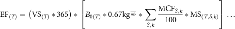 Bo(T) = maximum methane producing capacity for manure produced by livestock category T, m3 CH4 kg−1 of VS excreted