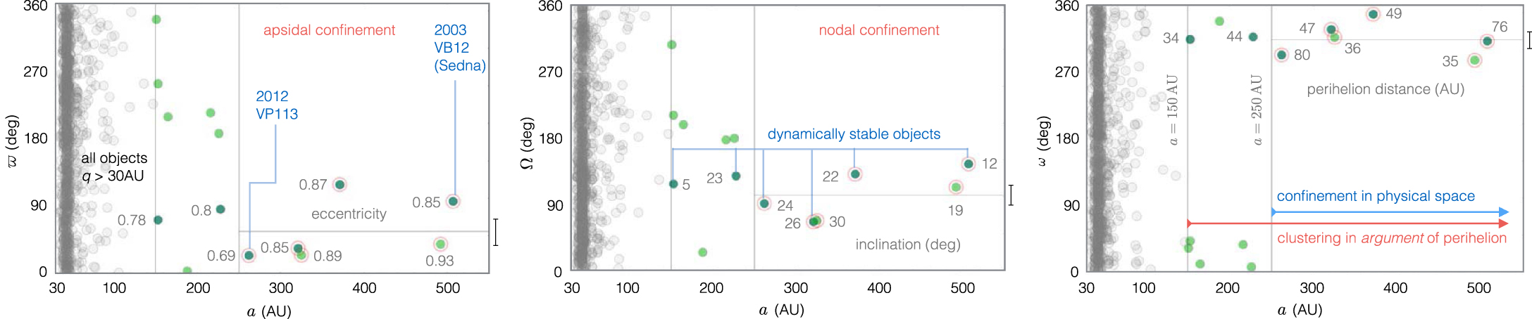 Figure 1. Orbits of well-characterized Kuiper-belt objects with perihelion distances in excess of q > 30 AU. The left, middle, and right panels depict the longitude of perihelion, ϖ, longitude of ascending node, Ω, and argument of perihelion ω as functions of semimajor axes. The orbits of objects with a < 150 AU are randomly oriented and are shown as gray points. The argument of perihelion displays clustering beyond a > 150 AU, while the longitudes of perihelion and ascending node exhibit confinement beyond a > 250 AU. Within the a > 150 AU subset of objects, dynamically stable bodies are shown with blue-green points, whereas their unstable counterparts are shown as green dots. By and large, the stable objects are clustered in a manner that is consistent with the a > 250 AU group of bodies. The eccentricities, inclinations, and perihelion distances of the stable objects are additionally labeled. The horizontal lines beyond a > 250 AU depict the mean values of the angles and the vertical error bars depict the associated standard deviations of the mean.