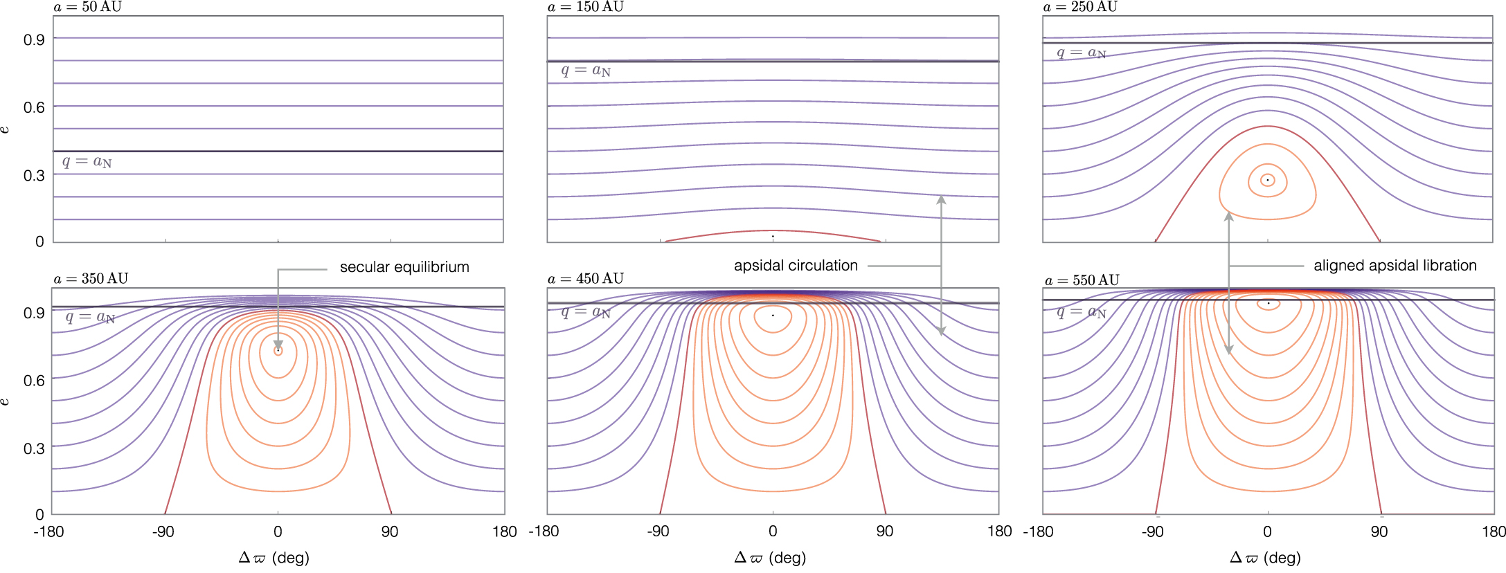 Figure 3 shows a series of phase-space portraits7 of the Hamiltonian (4) for various test particle semimajor axes and perturber parameters of m' = 10 m⊕, a' = 700 AU and e' = 0.6. Upon examination, an important feature emerges within the context of our simple model. For test-particle semimajor axes exceeding a ≳ 200 AU, phase-space flow characterized by libration of Δϖ (shown as red curves) materializes at high eccentricities.