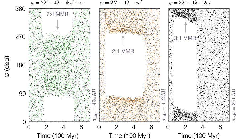 , where Σ ji = 0, within the first Gyr of evolution of a subset of long-term stable orbits with initial semimajor axes beyond a > 250 AU. Remarkably, we were able to identify temporary libration of such angles associated with 2:1, 3:1, 5:3, 7:4, 9:4, 11:4, 13:4, 23:6, 27:17, 29:17, and 33:19 mean-motion commensurabilities. Three low-order examples of persistent libration are shown in Figure 6, where the color of the simulation data corresponds to that of the boxed, emphasized orbits in the left panel of Figure 5.