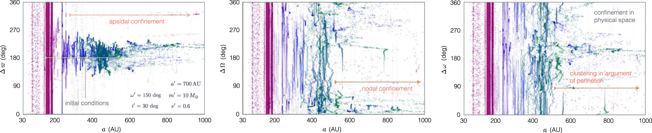 For our nominal simulation, we adopted a' = 700 AU, e' = 0.6, and m' = 10 m⊕, as before, and set the inclination and initial argument of perihelion of the perturber to i' = 30° and ω' = 150°, respectively. Figure 8 shows the simulated confinement of the orbital angles attained in this calculation. Clearly, the results suggest that the clustering seen in the observational data can be reproduced (at least on a qualitative level) by a mildly inclined, highly eccentric distant perturber. Moreover, the libration center of ΔΩ indeed coincides with the aforementioned theoretical expectation, suggesting that the dynamical origins of nodal grouping are in fact, secular in nature. Evidently, orbits that experience modulation of orbital inclination due to the circulation of Δ Ω are preferentially rendered unstable and removed from the system. Drawing a parallel with Figure 1, the longitude of perihelion, the longitude of ascending node, and the argument of perihelion are shown in the same order. We note, however, that in Figure 8 these quantities are measured with respect to the perturber's orbit (without doing so, orbital confinement becomes washed out due to the precession of the perturber's orbit itself). In this sense, the actual values of ϖ and Ω observed in the data hold no physical meaning and are merely indicative of the orientation of the perturber's orbit.