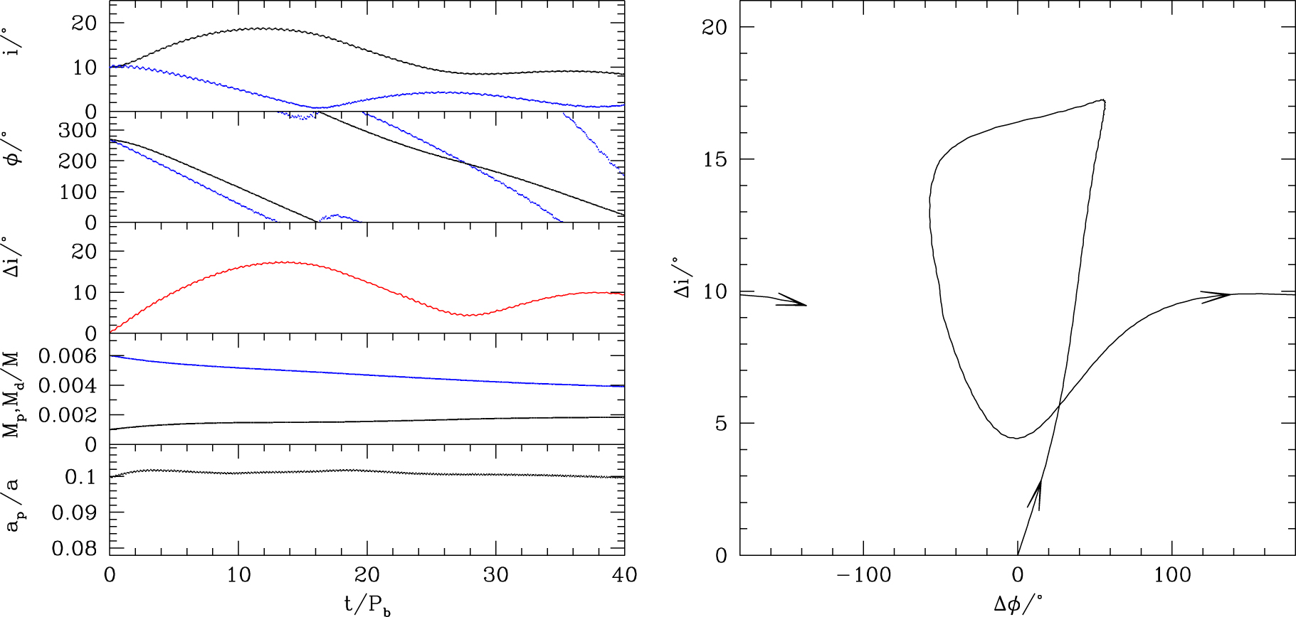 . The fourth graph plots the mass of the planet and the disk and the bottom graph plots the the semimajor axis of the planet. Right: phase portrait of the relative planet–disk tilt and phase angle averaged over the previous binary orbit vs. nodal phase difference,
