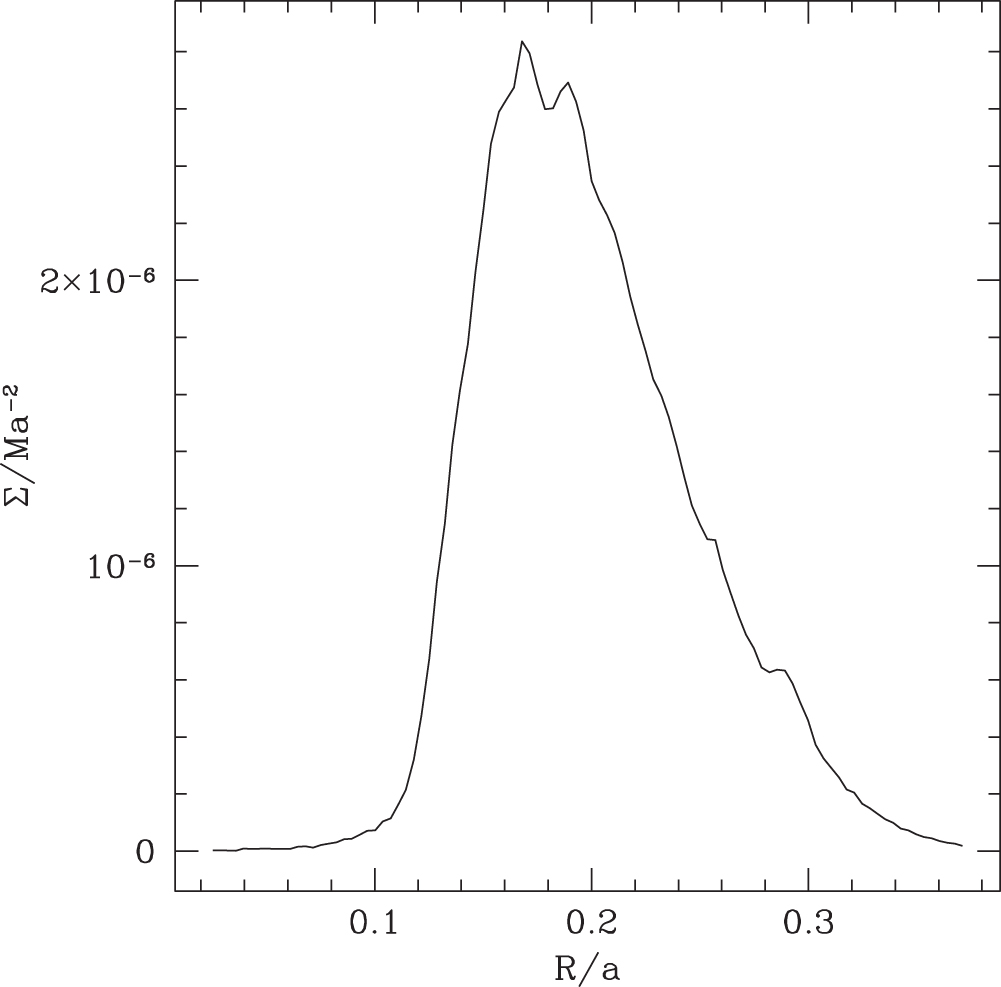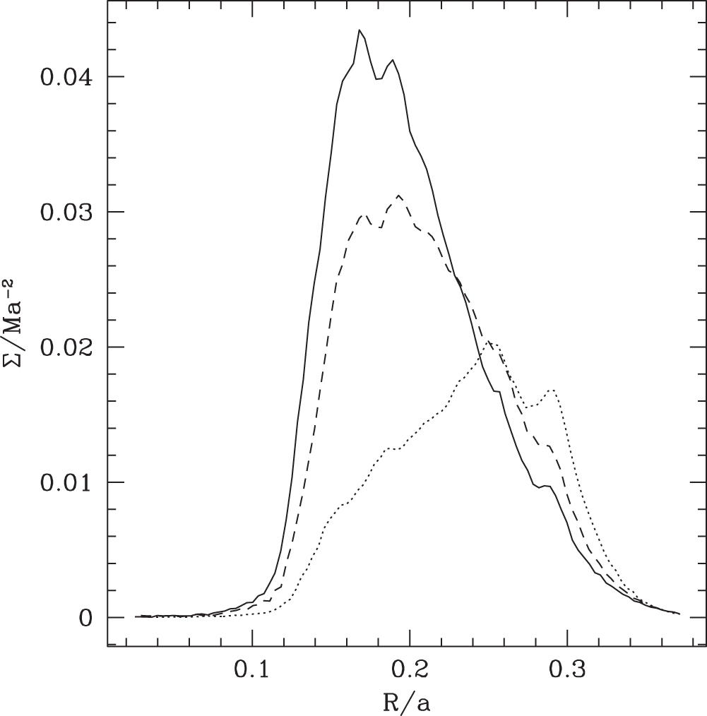 The disk surface density evolution is plotted in Figure 12. The solid line plots the initial surface density distribution that is obtained by rescaling the density distribution obtained from the evolved coplanar configuration (plotted in Figure 8) so that the initial disk mass is