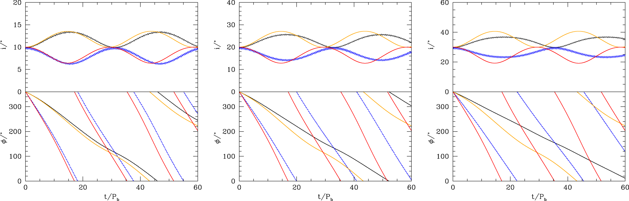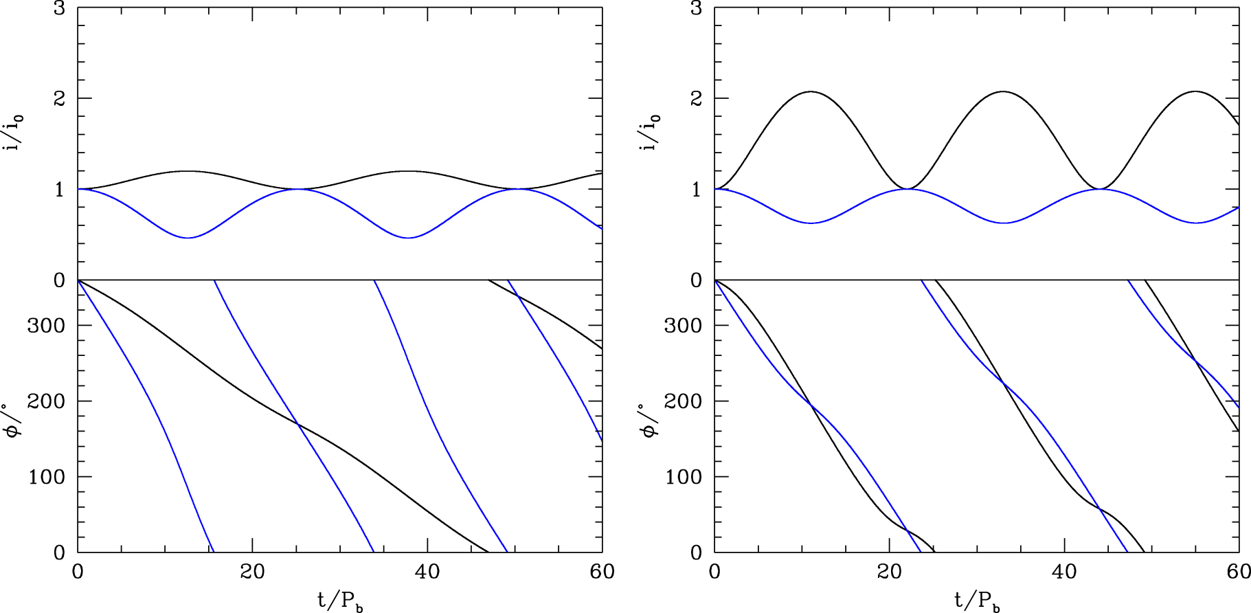 Figure 1 shows the evolution of the inclinations and phase angles in a system with the standard parameters described in Section 2.2, except that we consider variations to the disk mass