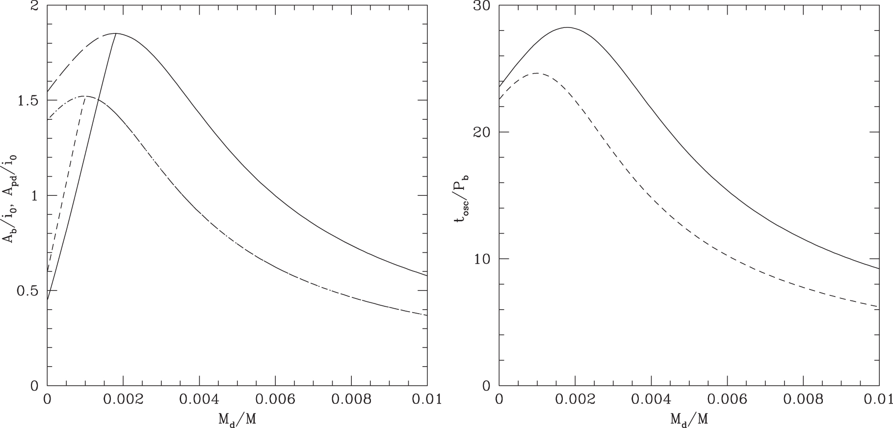 ). The planet and the disk orbital planes are initially coplanar, but tilted by angle i0 with respect to the binary. Note that the solid and long-dashed, as well as the short-dashed and dashed–dotted lines, overlap at larger disk masses (beyond the plot peak values) because the mean precession rates of the planet and disk are locked, although significant relative tilts are present. Right: the inclination oscillation periods for the solid and short-dashed line cases plotted in the left panel.