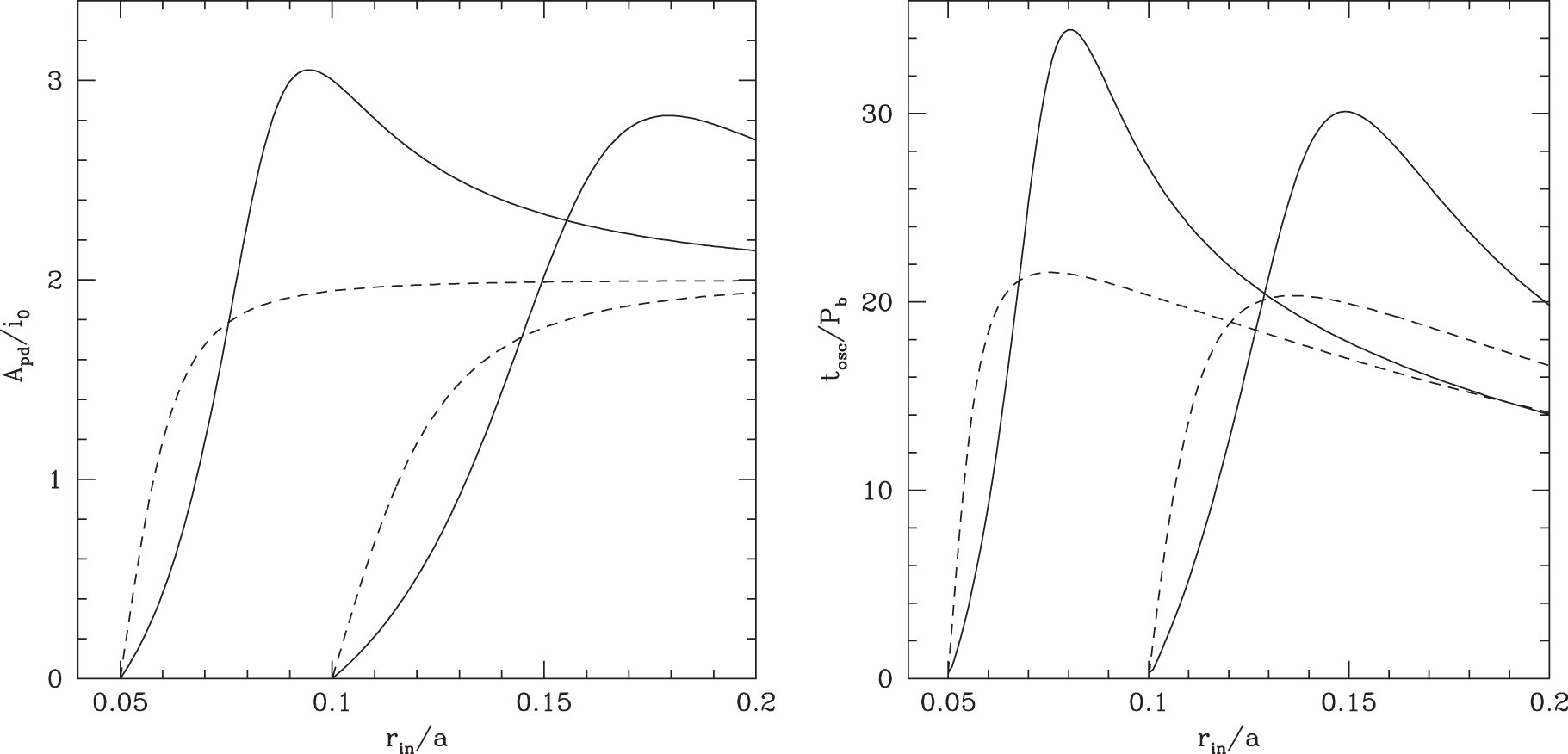 The level of planet–disk misalignment undergoes periodic oscillations. We measure this misalignment by the amplitude of these oscillations. The left-hand panel of Figure 2 plots the normalized oscillation amplitudes of planet–disk tilt differences as a function of disk mass. The right-hand panel plots the oscillation period as a function of disk mass. The amplitude is determined in two different ways. One set of lines (solid and short-dashed) plots the oscillation amplitude (the maximum value over time) of the difference in the planet and disk tilts relative to the binary orbital plane
