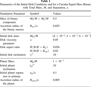 In order to simulate a planet–disk system, we must choose an appropriate initial disk density distribution. In the case of coplanar systems, we can choose a disk profile with or without an initial gap. As the system evolves, a reasonably stable equilibrium gap structure is produced typically in less than 100 planet orbits (e.g., Bate et al. 2003). In case of a planet–disk system that is misaligned with respect to a binary, the initial conditions need to be more accurately established because the disk could precess substantially before an equilibrium gap is established. That is, an initially aligned planet–disk system may not retain this desired initial relative alignment until the equilibrium gap is established. A further problem is that if we start without a gap, the planet can gain substantial mass before gap opening and thereby prevent us from easily controlling the planet mass when an equilibrium gap is established.