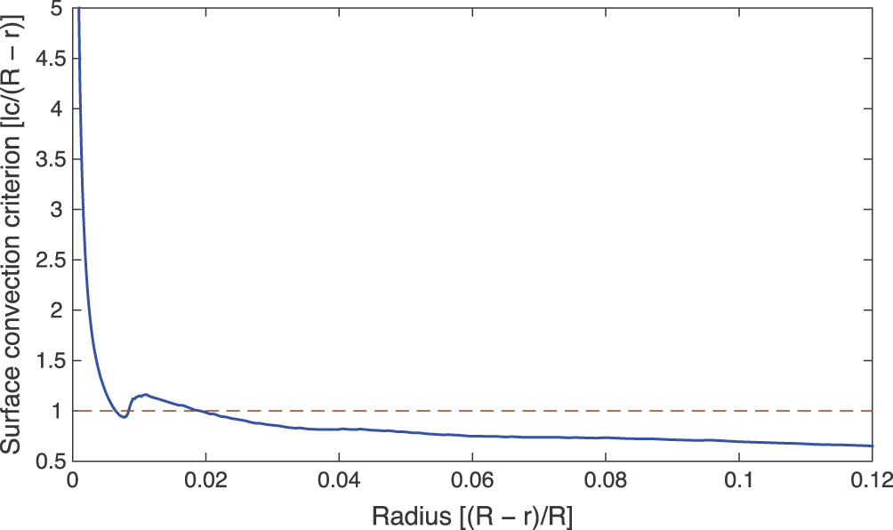 , as a function of interior radius for a 20 M⊙ model with convective overshoot and α = 1.8. This shows that the typical size of a convective cell near the surface is less than about 2% of the radius of the star. Hence, the observed surface hot spots that cover as much as ∼10% of the stellar disk would have to result from large fluctuations in the size distribution. The temperature change at the surface from our model is ΔT ≈ 300 K, which for a large fluctuation in spot size would correspond to a 20% change in luminosity and be consistent with the observations.