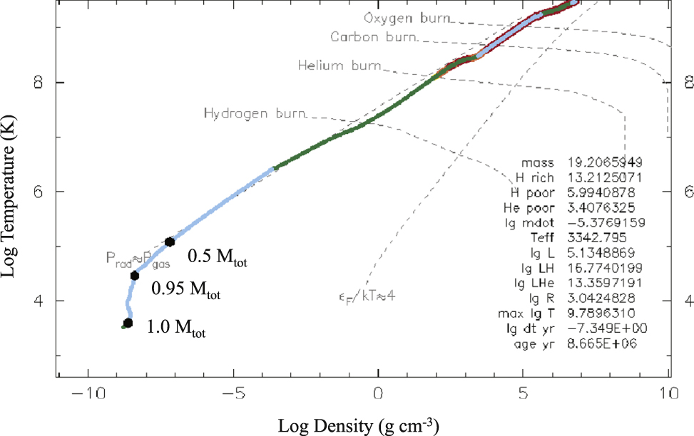 Figure 11. Interior temperature vs. density plot near the end of the lifetime of the best-fit 20 M⊙ progenitor model obtained with the MESA code.