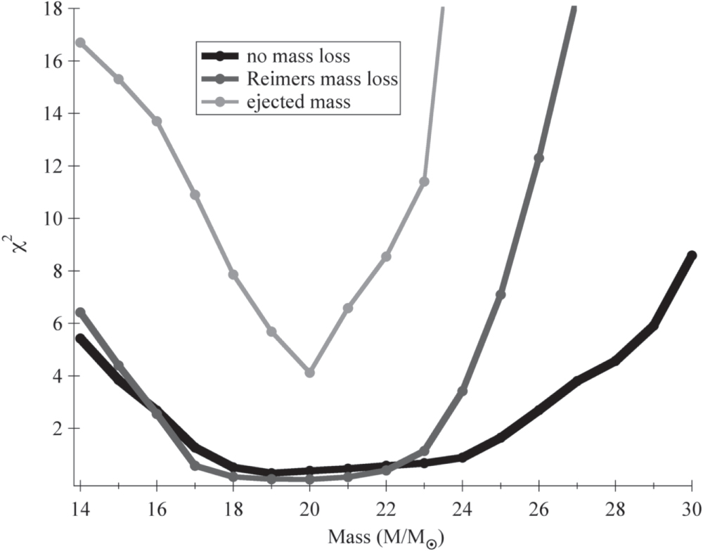 Figure 5 shows a comparison of the total mass ejected as a function of time from the base of the RGB. These curves are based on the Reimers (1975) rate with a mass-loss parameter of η = 1.34 for both the EG (thick solid line) and the MESA (thick dashed line) 20 M⊙ progenitor models. With our adopted parameters we find that by the time the star reached the main-sequence turnoff it had lost 0.1 M⊙ in both models, and by the time it reached the base of the RGB it had lost 0.3–0.4 M⊙. It is possible, however, that our adopted Reimer's mass-loss parameter overestimates the main-sequence mass loss. Winds during the main-sequence phase are very different from the winds during the RSG phase. During the main sequence, winds are mainly radiatively driven, while the RSG winds involve molecules, dust, etc. Hence, these tracks represent upper and lower limits for the mass-loss evolution of this star.