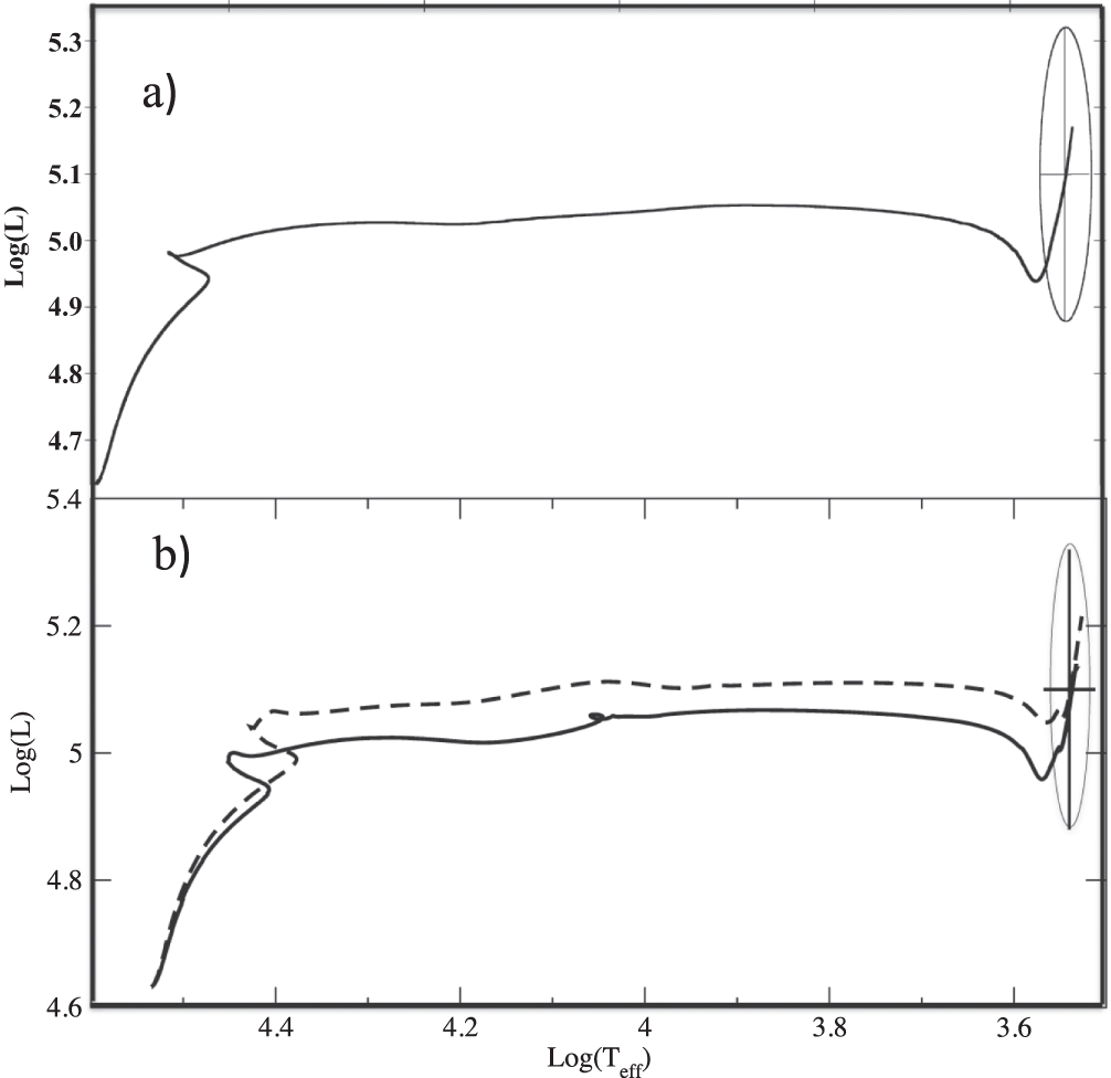 Figures 4(a) and (b) show H-R diagrams for the 20 M⊙ modified EG model and the MESA-code model, respectively. The H-R diagrams are quite similar. The dashed line in panel (b) of Figure 4 shows the H-R diagram for a 20 M⊙ model calculated with the MESA code with an overshoot parameter f = 0.015. Here one can see that the main effect of the convective overshoot is to increase the luminosity of the main-sequence turnoff and the base of the RGB. It does not, however, affect the luminosity or temperature of the star as it moves up the giant branch. Hence, there is little constraint on convective overshoot from the observed luminosity and temperature. A value of f = 0.3, however, moves luminosity of the base of the RGB all the way up to the observed luminosity. This much overshoot, however, is inconsistent with the observed C and N abundances, as we shall see below.