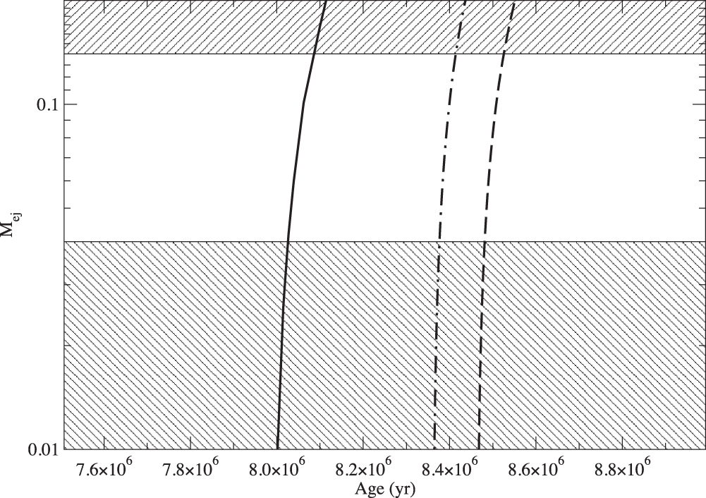 Standard image High-resolution imageThe shaded areas indicate the excluded regions based on our adopted uncertainty on the total ejected mass in Table 5. The MESA track indicates a more advanced lifetime as it ascends the RGB. The older age for the MESA models is mostly attributable to the increased opacity at low densities and temperatures in the MESA model. This leads to lower luminosity and hence longer lifetimes. In the context of these models, the amount of mass ejected corresponds to a present age since the zero-age main sequence (ZAMS) of ∼8.0 Myr in the EG model and about 8.5 Myr in the MESA model. For both models the ages are about 0.1 Myr less when convective overshoot is included. Here we adopt the ages in the MESA model without convective overshoot as the most realistic, but we include the EG model results as an illustration of the uncertainty in this age estimate.