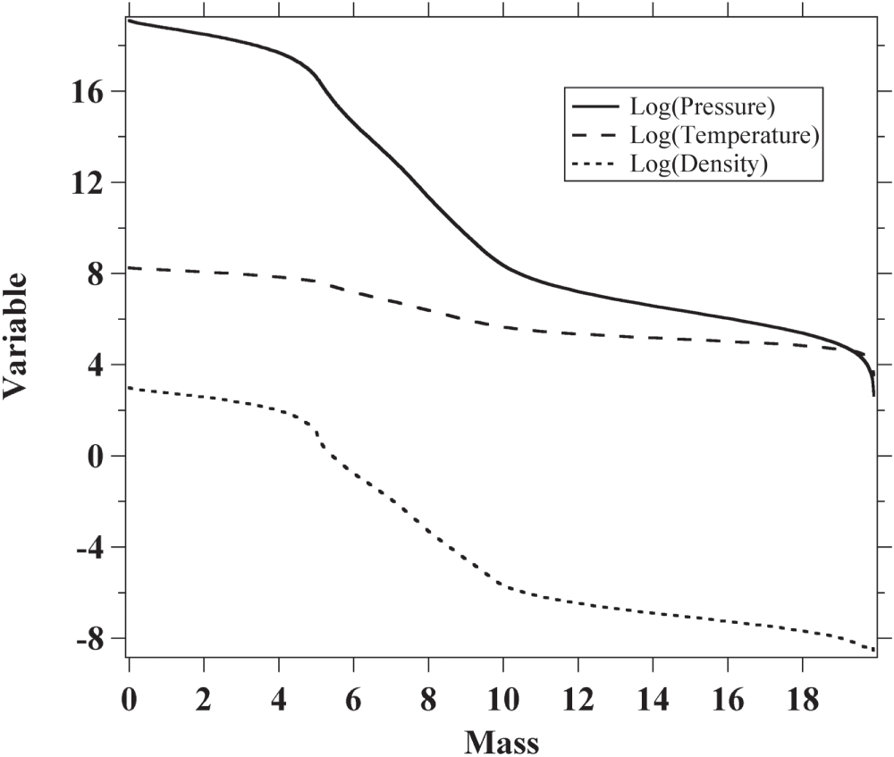 Figure 6. Thermodynamic state variables ρ, T, and P as a function of mass for our best-fit 20 M⊙ model.
