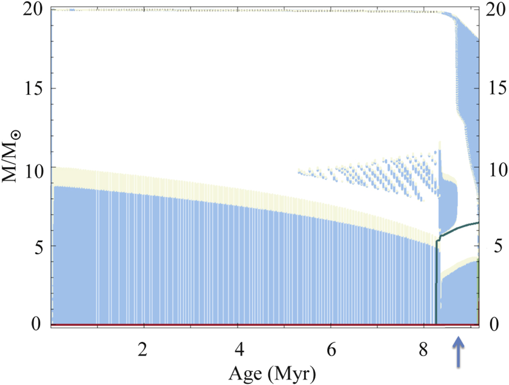 Figure 8. Kippenhahn diagram showing evolution of convective zones for a 20 M⊙ model computed with the MESA code with α = 1.8 and a convective overshoot parameter of f = 0.015. Darker shading indicates regions that are unstable to convection by the Ledoux criterion. Lighter shading indicates the regions of convective overshoot.