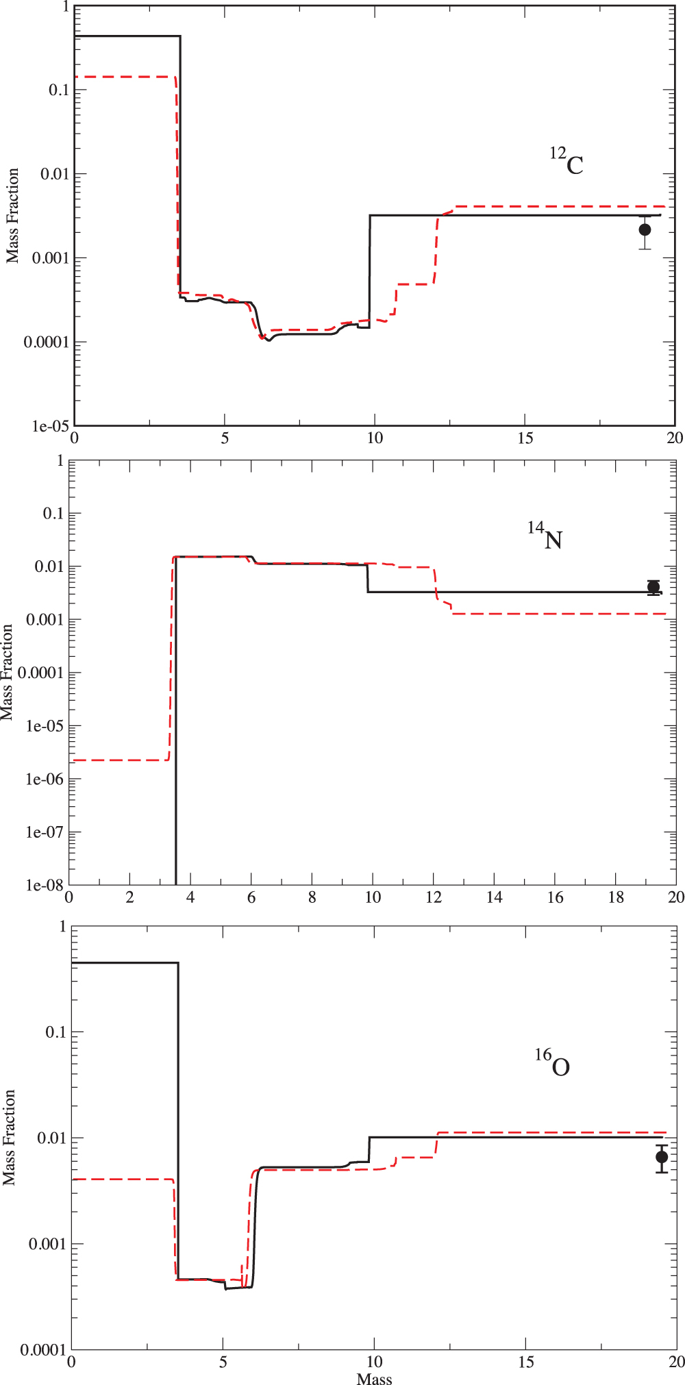 Figure 9. Effects of convective overshoot on elemental composition. Solid line shows interior C (top panel), N (middle panel), and O (bottom panel) abundances as a function of interior mass for the 20 M⊙ progenitor MESA model. Points are total elemental surface abundances from Table 4. Dashed lines shows the effect of convective overshoot with mixing parameter f = 0.015.