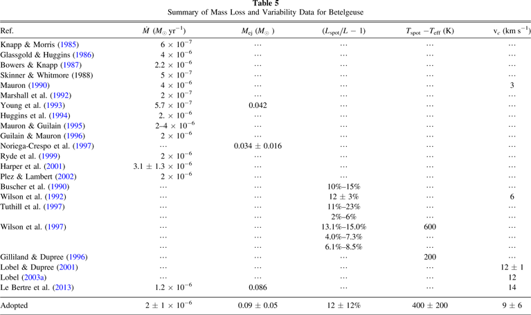 In spite of its brightness, confusion in the proper motion, variability, asymmetry, and large angular diameter have together made the determination of the distance to this star difficult. A summary of the astrometric data is presented in Table 1. The first parallax distance measurements reported by Hipparcos (∼131 pc) and Tycho (∼54 pc) disagreed by more than a factor of two (ESA 1997). This was well outside the range of quoted errors. However, the more recent VLA-Hipparcos distance to Betelgeuse of ∼197 ± 45 pc (Harper et al. 2008) has been derived from multiwavelength observations. This is the value adopted here as having the greatest accuracy and least distortion from the variability.