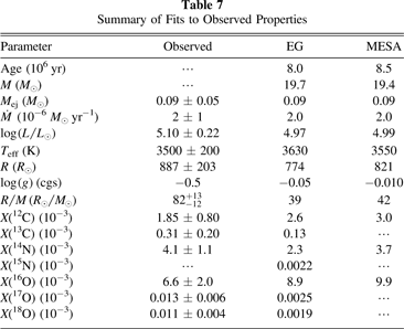 Figures 7(a)–(b) show composite plots of isotopic abundances versus interior mass from the best-fit EG and MESA 20 M⊙ progenitor models. These are compared with the surface isotopic compositions determined by Harris & Lambert (1984) and Lambert et al. (1984). The surface CNO surface abundances computed in both models are quite consistent with the observations as shown by the points in the figures. Hence, the models have correctly evolved the star through the first dredge-up.