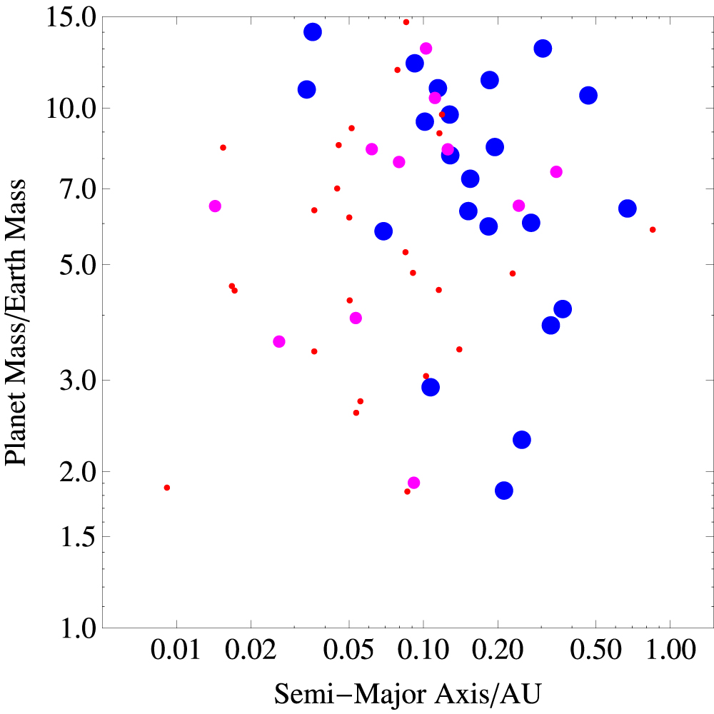 Figure 1. Planet mass and semimajor axis of the observed exoplanets with a mass in the range