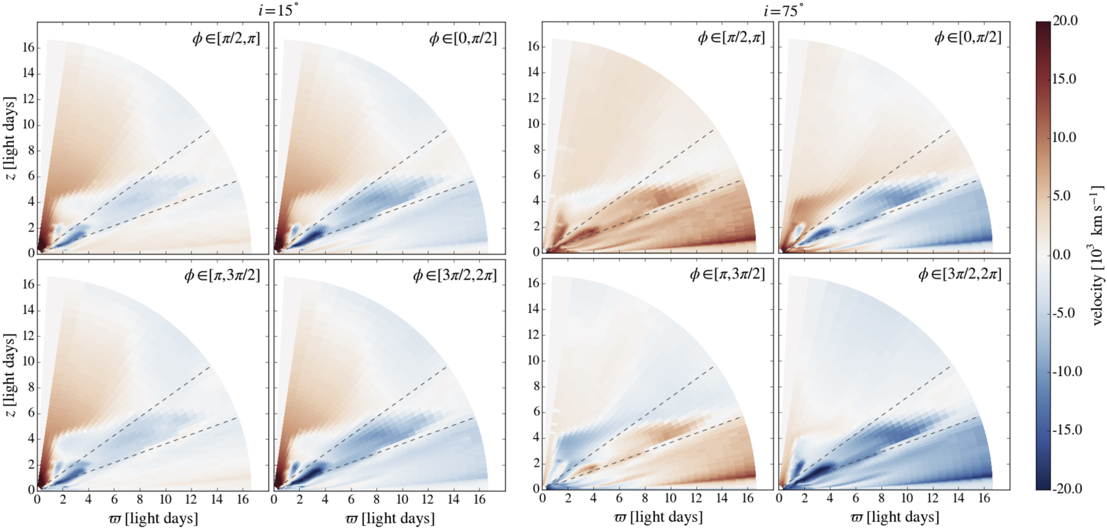- (i)Echo images of virialized disk wind solutions overall resemble those of randomly oriented cloud models or pure disk models. The features introduced by the disk wind are asymmetric and dependent on inclination angle and opacity. However, contributions from the wind are typically an order of magnitude or more smaller in flux outside of the "virial envelope" formed by the rotational component (see Figure 6). Because the flux difference is sensitive to the opacity, optically thick and thin lines can be expected to form different echo images. Wind contributions within the virial envelope mask any symmetry or distinct emission patterns that are characteristic of purely Keplerian motion.