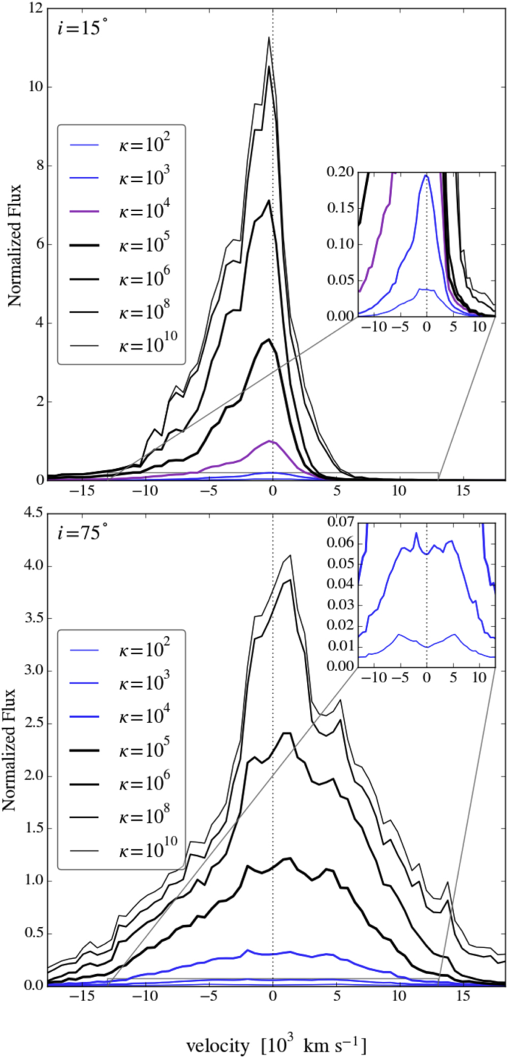 .) Both the line flux and degree of broadening increase monotonically with κ, and this is true at intermediate inclinations as well. For