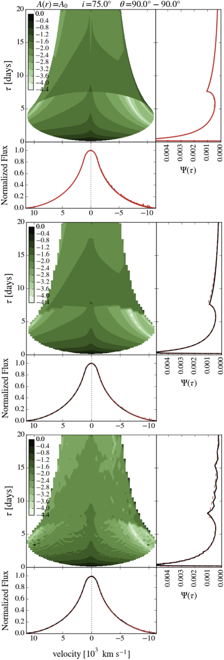 We further benchmarked our code against a spherically symmetric wind model from Welsh & Horne (1991). This test was needed to verify our integration over μ since the CM96 solution does not test this aspect of our code. We again found an exact match at high resolutions, and the echo image, line profile, and transfer function were all sufficiently reproduced upon using the PK04 grid. We conclude from these tests that high resolution simulations will be needed when there are steep gradients in the velocity or density fields in order to obtain smooth line profiles and transfer functions.