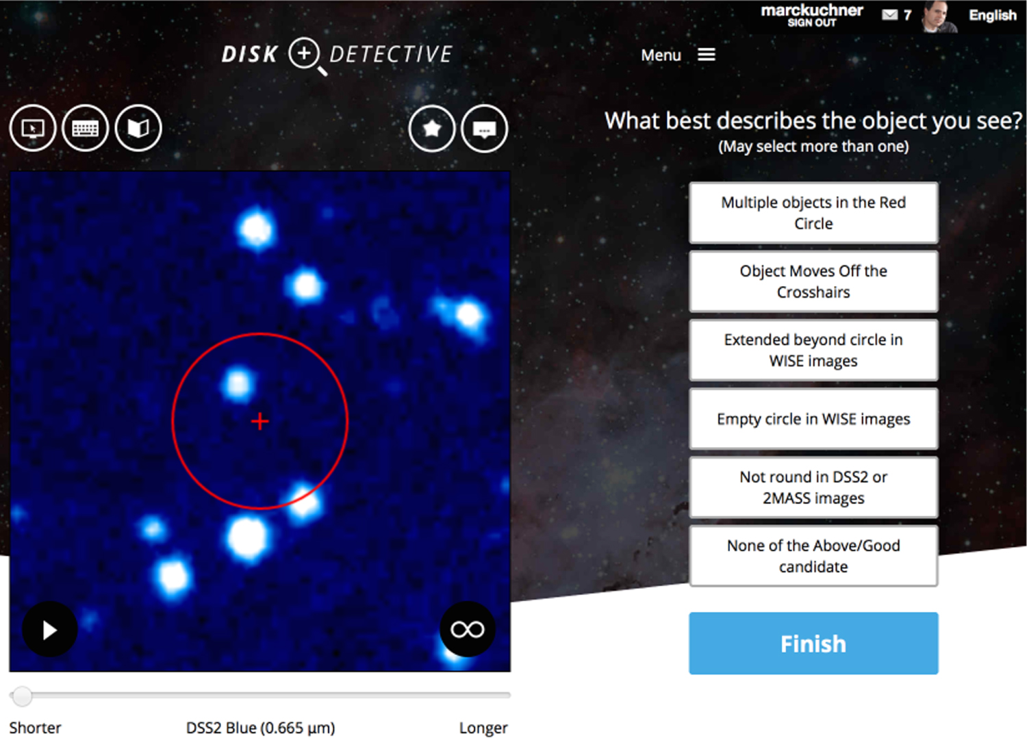 Users view the flipbook by clicking on an arrow-shaped "play" button on the lower left of the screen, shown in Figure 1. They also have the option to scroll through the flipbook frame by frame using the scrub bar beneath it. The frames are each labeled with the wavelength and the name of the survey that yielded the image, e.g., "2MASS K (2.16 μm)." After a user has viewed the whole flipbook, he or she can then choose from among six classification buttons to click on, labeled "Multiple objects in the Red Circle," "Object Moves off the Crosshairs," "Extended beyond circle in WISE Images," "Empty Circle in WISE images," "Not Round in DSS2 or 2MASS images," and "None of the Above/Good Candidate." With the exception of the "None of the Above" option, the user can choose more than one description per flipbook. After at least one of these classification buttons is chosen, a button labeled "Finish" becomes active; clicking this button records the user's choices and causes the next flipbook to appear.