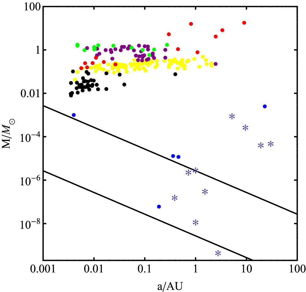 Figure 1. Pulsar companion mass and semimajor axis. The mass is the median mass assuming an orbital inclination of i = 60°. The assumed primary pulsar mass is 1.35 M⊙. The companions are planets (blue points), main-sequence stars (red points), ultra low-mass (black points), neutron stars (green points), CO or ONeMg white dwarfs (purple points) or helium white dwarfs (yellow points). The blue stars show the eight planets in the solar system, the Moon, and the asteroid Ceres. The solid lines show the detection limit for timing residuals of 1 μs (lower line, applicable for millisecond pulsars) and 1 ms (upper line, applicable for normal slow pulsars) found with Equation (1).