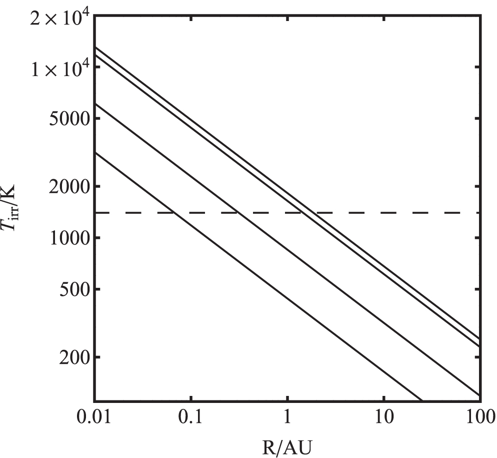 Figure 2. Irradiation temperature as a function of radius from the pulsar for a steady-state disk for four different accretion rates. The upper solid line is for accretion rates of