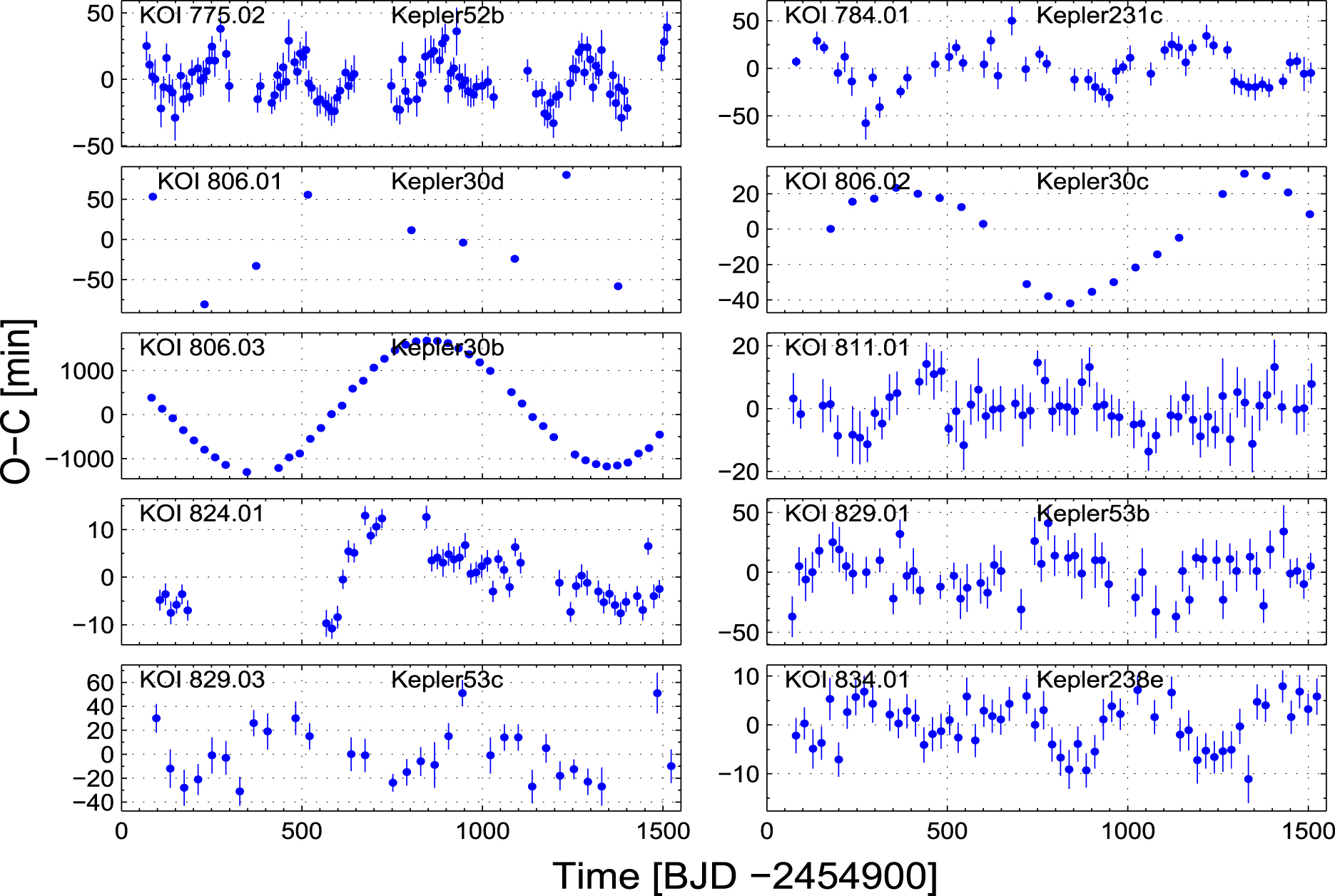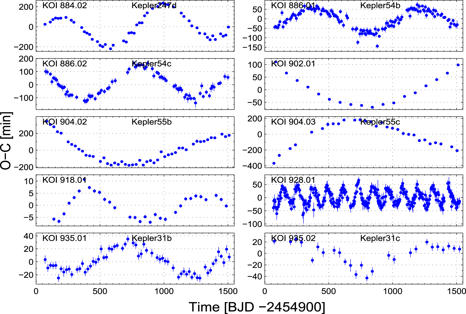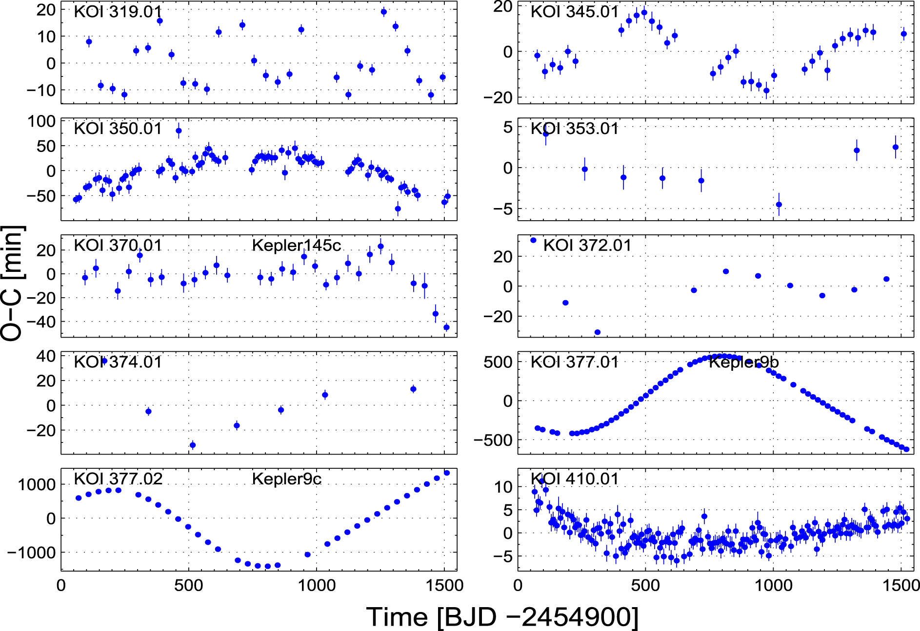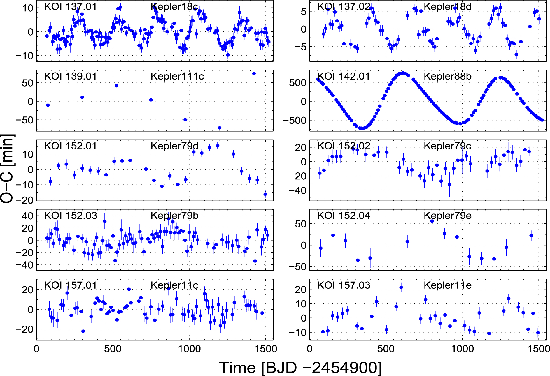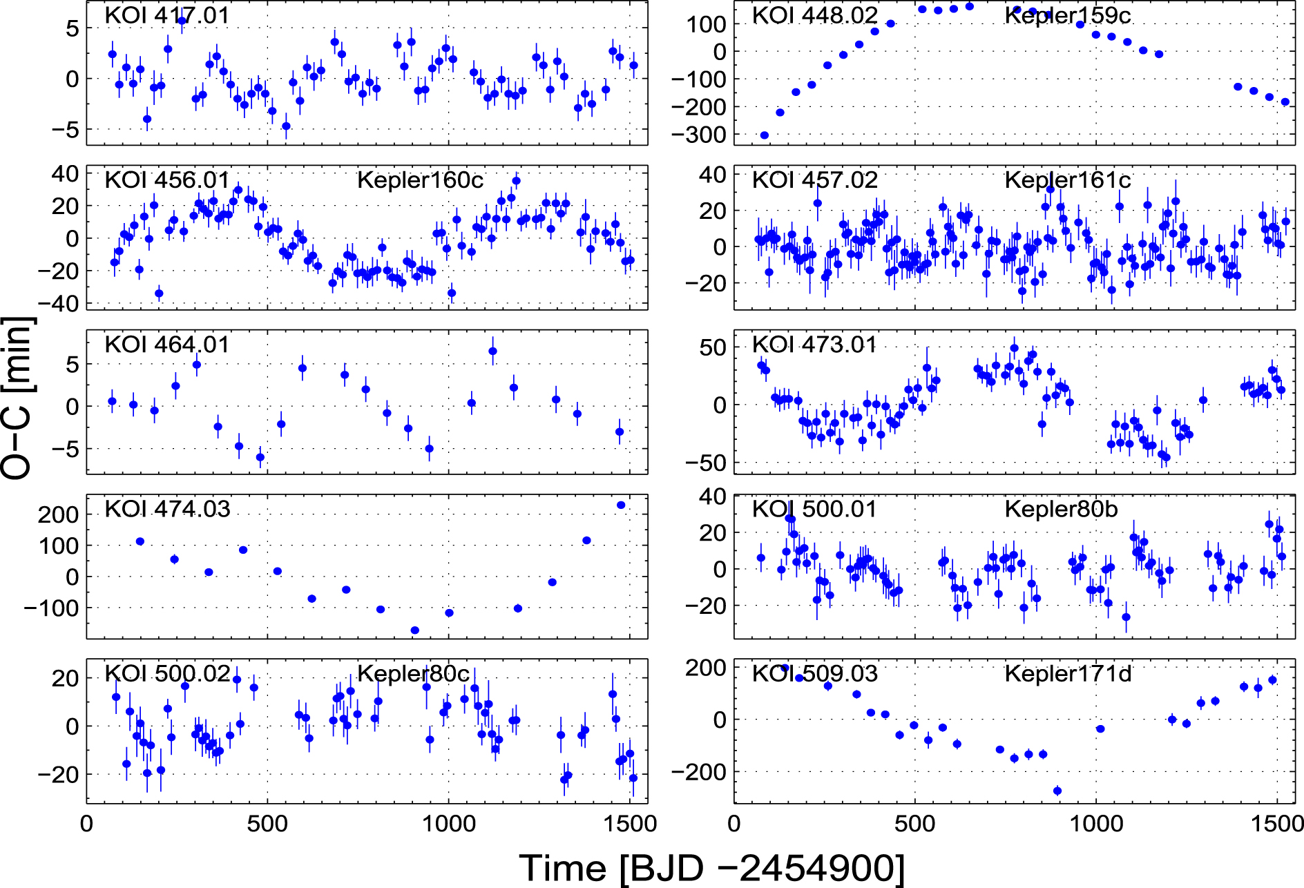 More than four years of almost uninterrupted performance of the Kepler mission produced about 190,000 light curves with high precision, leading to the discovery of more than 8000 planet candidates (=KOIs)7 that show periodic shallow transits caused by small eclipsing objects. Many of the KOIs display shifts of the transit timings (O-Cs) relative to a strict periodicity, which is expected if the transiting planets were to move on a Keplerian orbit. These O-Cs, sometimes called transit time variations (=TTVs), can indicate a dynamical interaction with additional objects in the system, as was predicted by the seminal works of Holman & Murray (2005) and Agol et al. (2005).