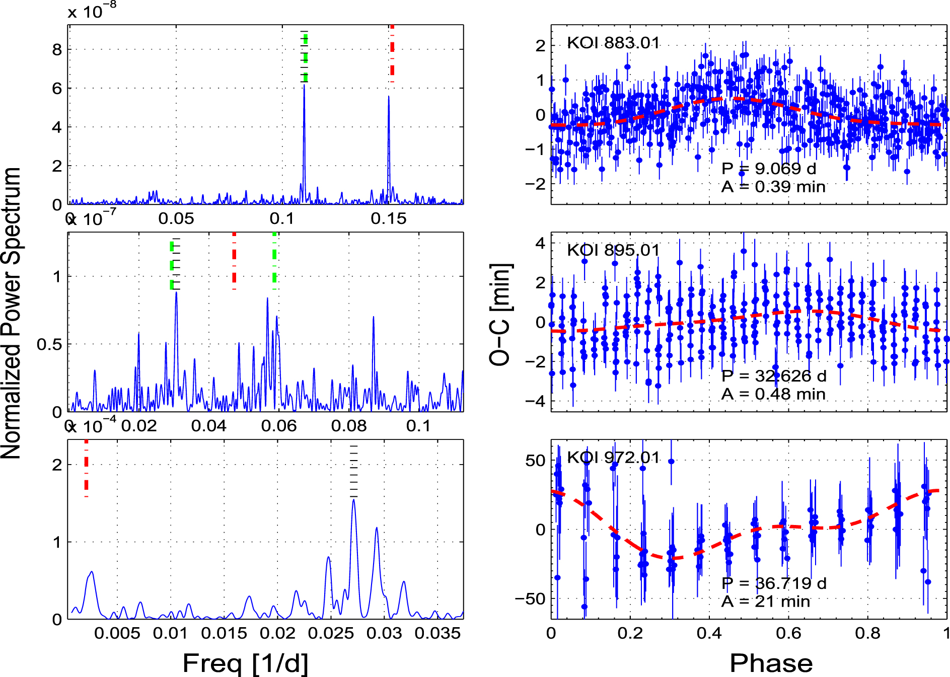 For most of the KOIs, we need more data before the TTV period can be robustly determined. However, as the Kepler mission in its original mode of operation has been terminated, we do not expect any additional Kepler TTVs. The next space missions that will observe the Kepler field in a search for transiting planets (e.g., TESS, PLATO), or dedicated ground-based follow-up observations (e.g., Raetz et al. 2014), may be very useful for determining the true nature and TTV periodicity of these systems.