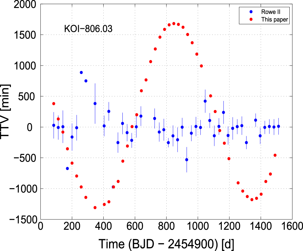 - 3.124 KOIs labeled significant by RoweII and by this work—in almost all cases the TTVs were comparable. Only KOI-806.03 displayed timing measurements that were significantly different in the two works. The two sets of derived TTVs are presented in Figure 34 (see also Sanchis-Ojeda et al. 2012). RoweI and RoweII probably missed the actual timings of this KOI because of the large TTVs.